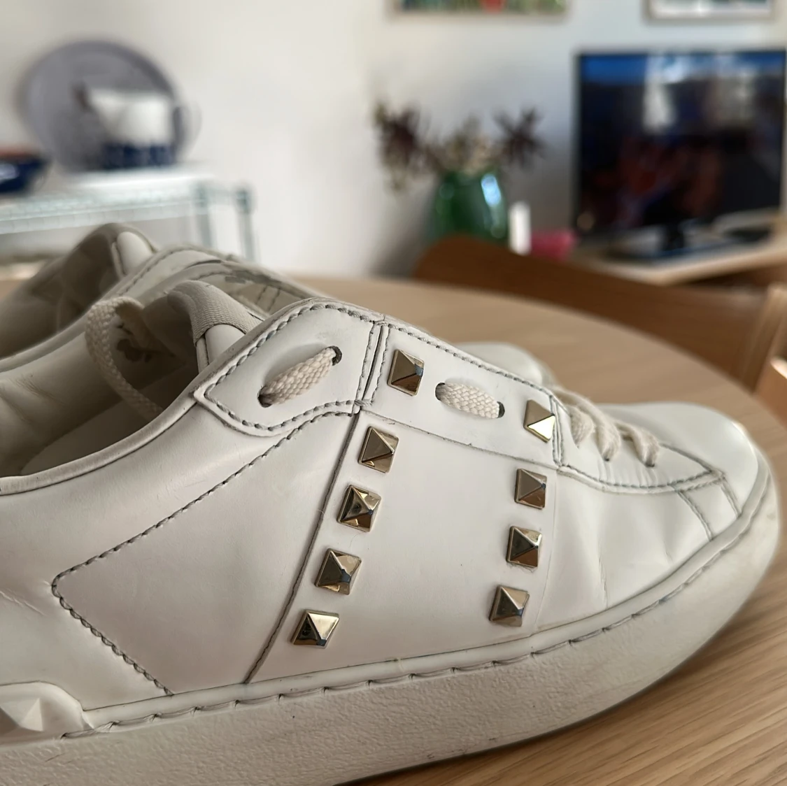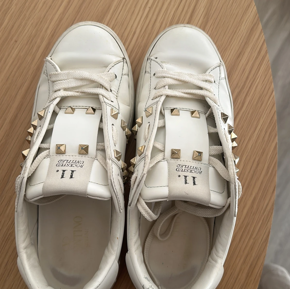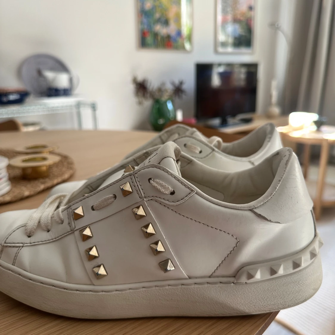 Vita Valentino Rockstud sneakers i skinn med guldfärgade nitar längs sidorna. Köpta 2023 för 7500 kr, dem är väl använda så det finns lite slitningar.
