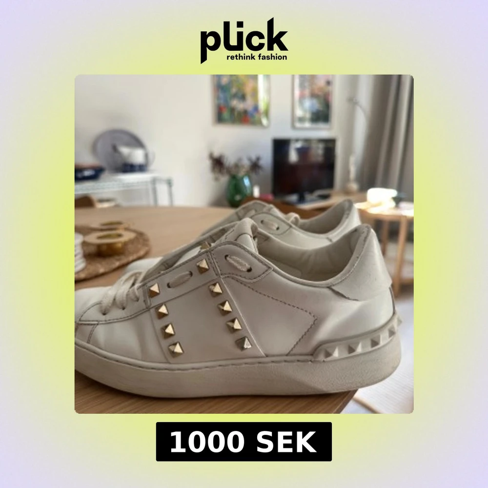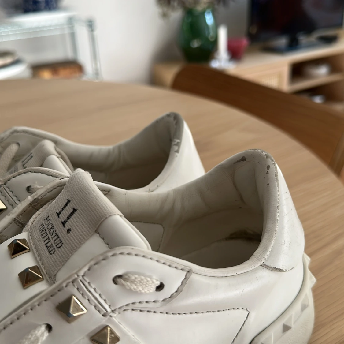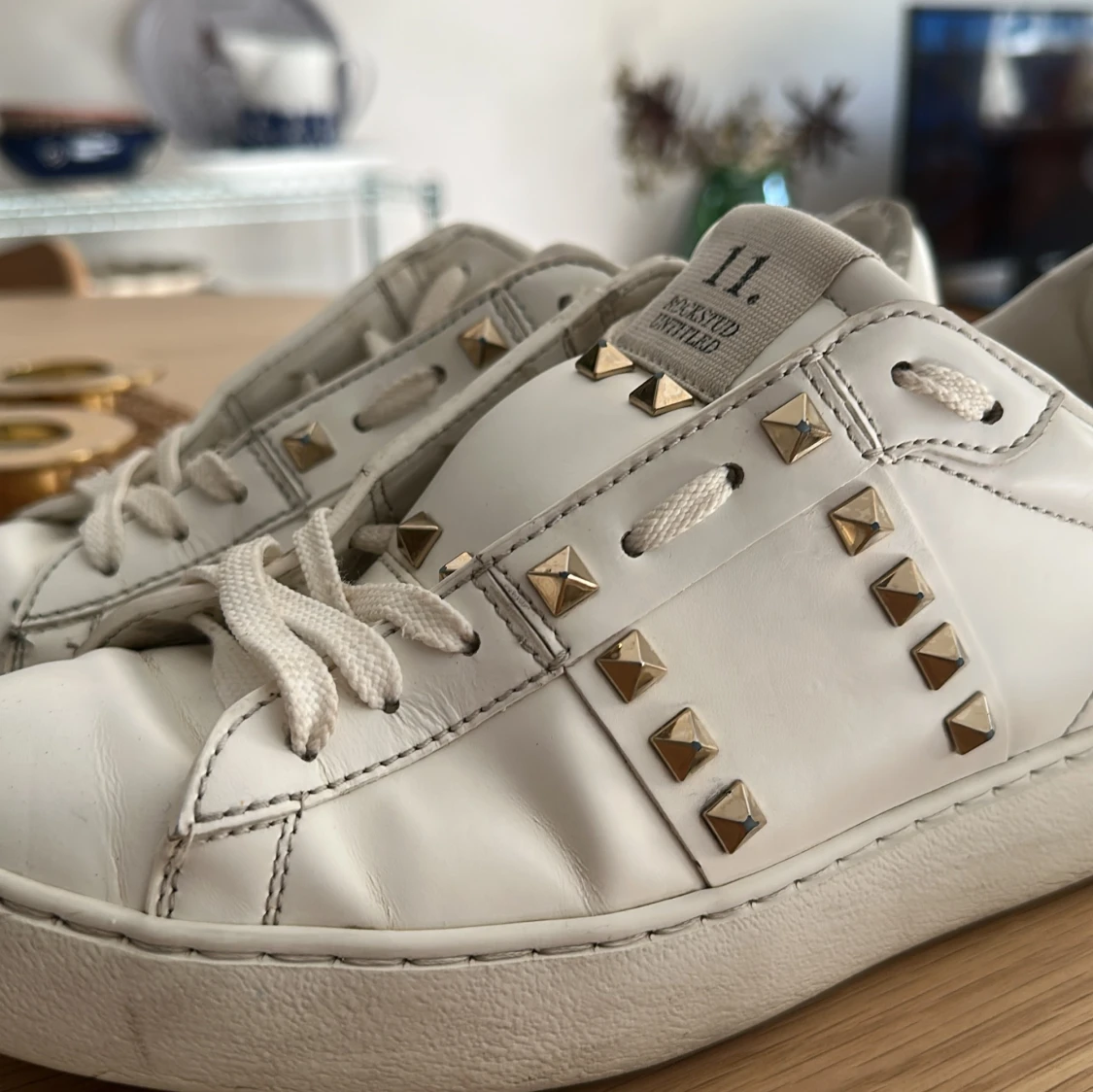 Vita Valentino Rockstud sneakers i skinn med guldfärgade nitar längs sidorna. Köpta 2023 för 7500 kr, dem är väl använda så det finns lite slitningar.