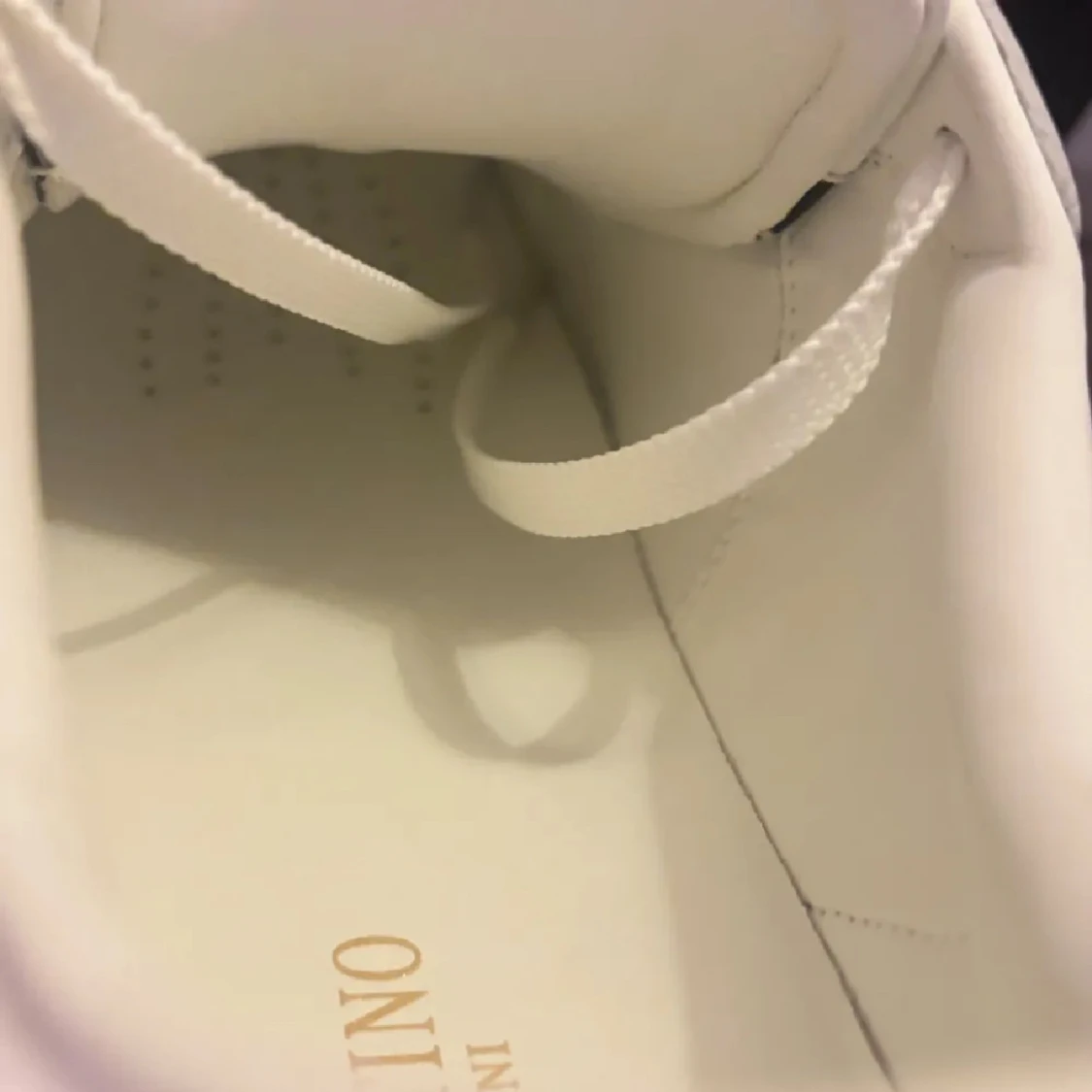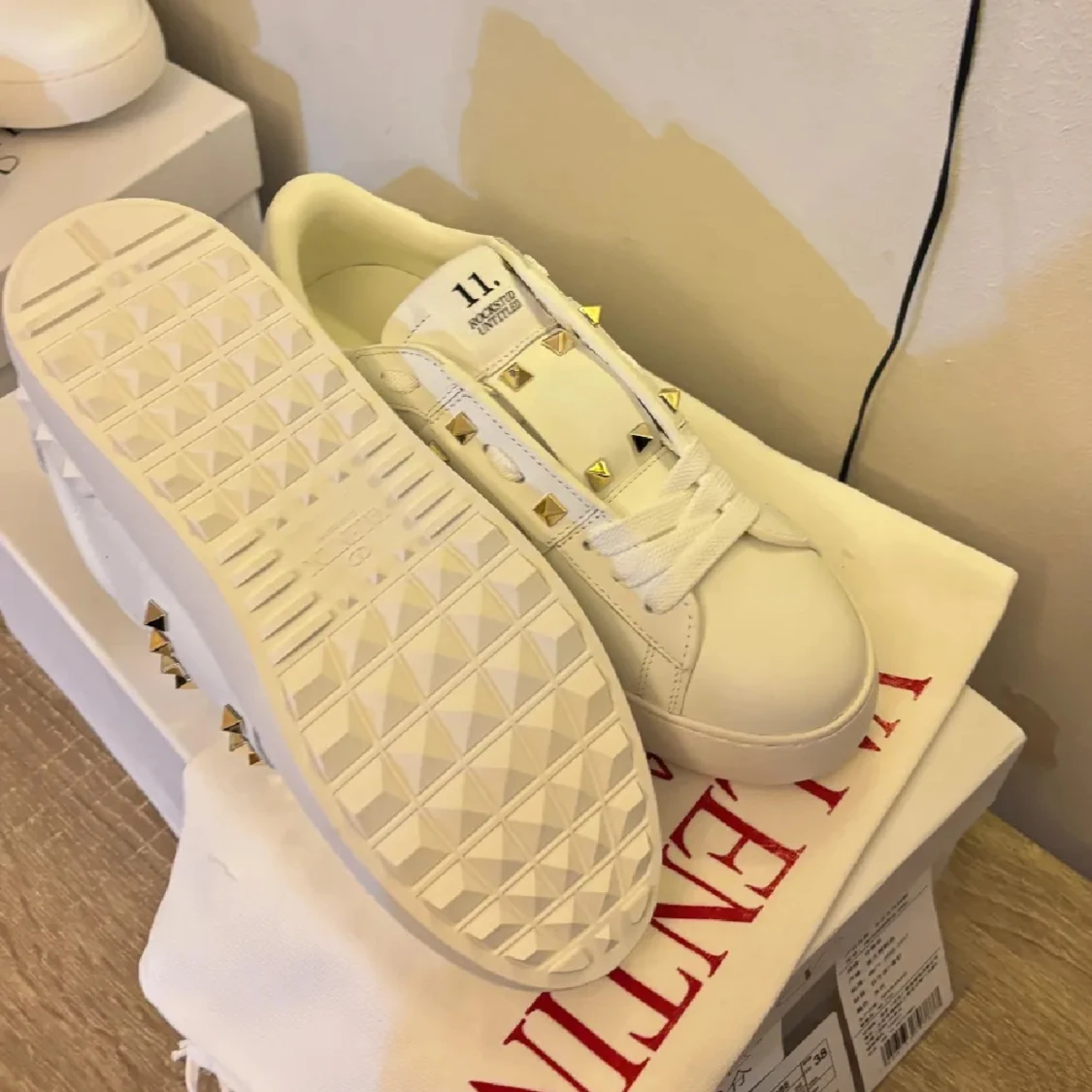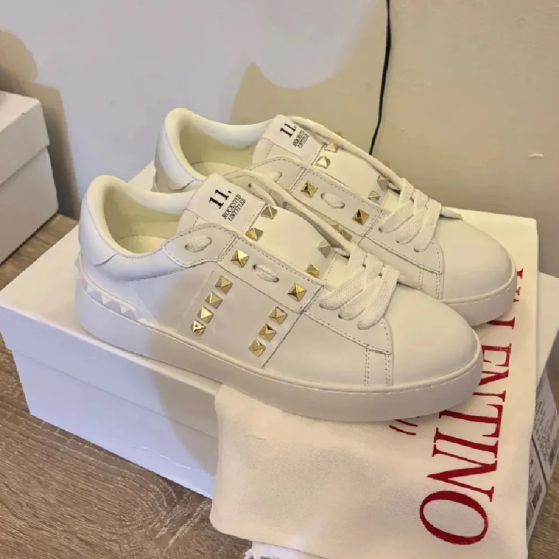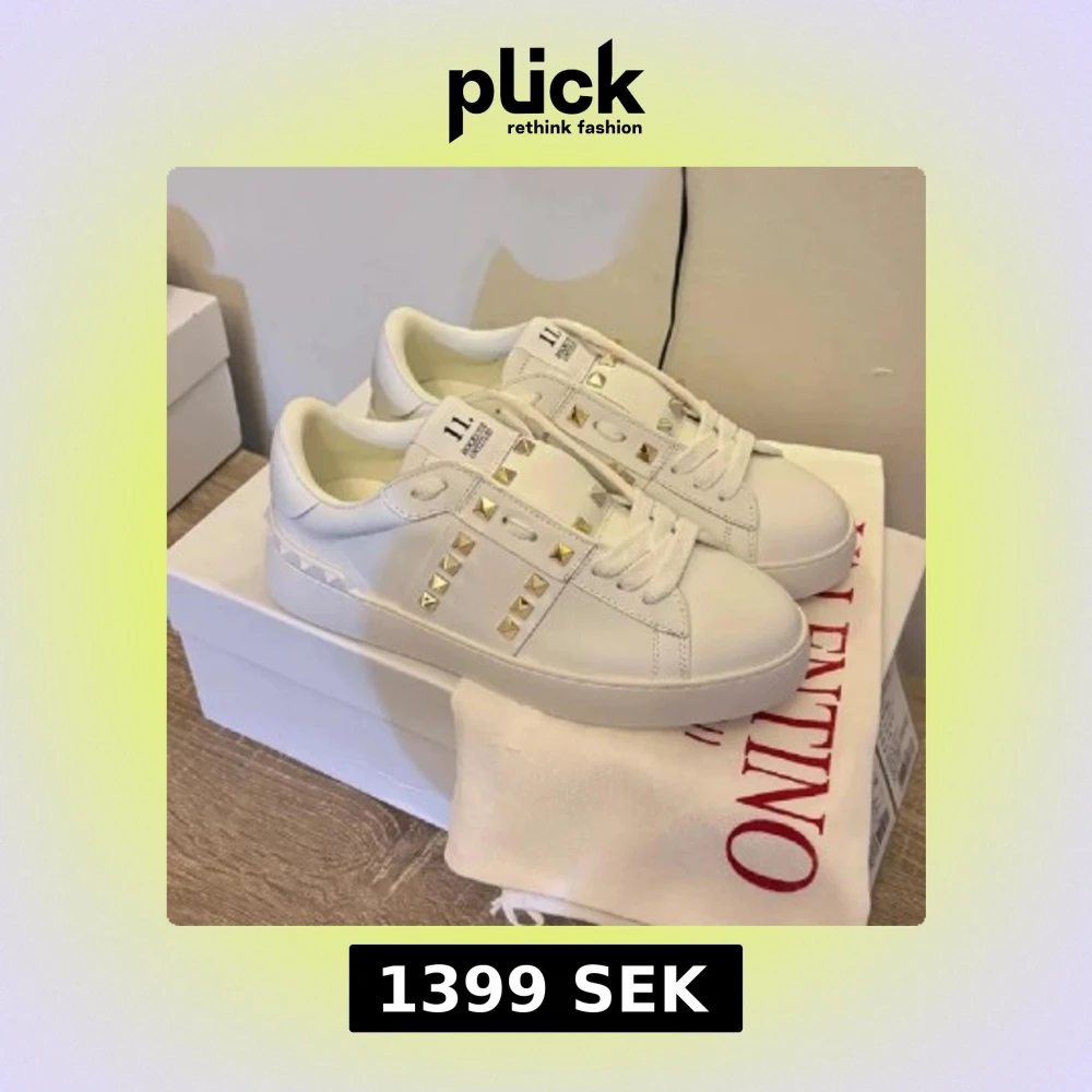 Snygga vita Valentino Rockstud sneakers i skinn med ikoniska guldiga nitar längs sidorna och på hälen. Klassisk rund tå, platt sula och vita snören. Perfekta för dig som vill ha en clean look med lite edge. Kommer med originalpåse och box.