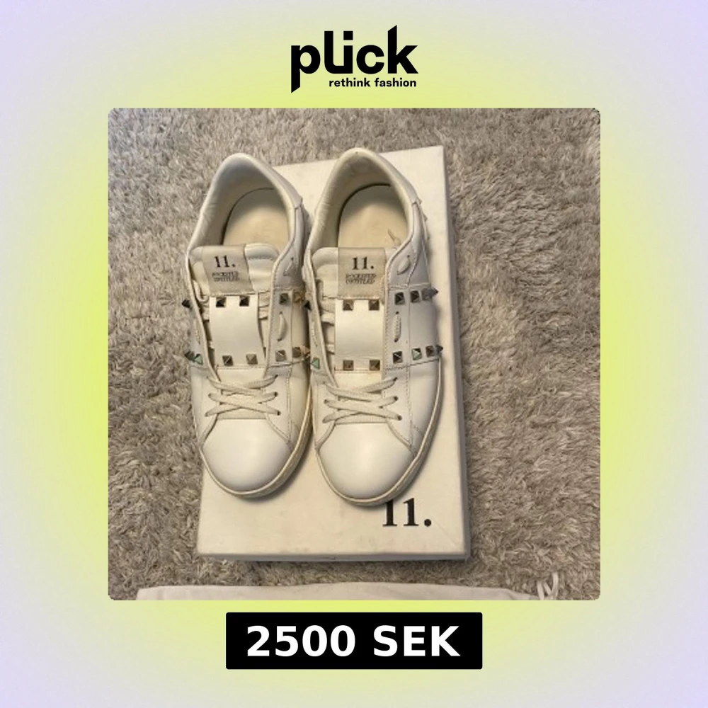 Snygga vita Valentino Rockstud sneakers i skinn med ikoniska silverfärgade nitar och klassisk snörning. Skorna har rund tå och platt sula, samt coola detaljer som gör dem till ett statement-piece. Perfekta för dig som vill sticka ut med en lyxig Grisch stil. Vid frågor de bara att skicka ett dm 😁