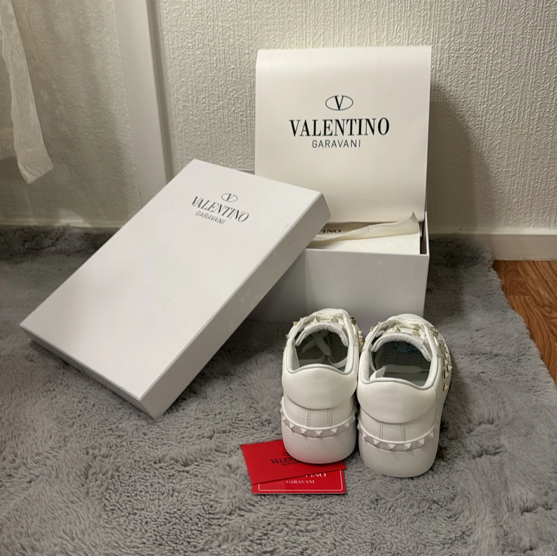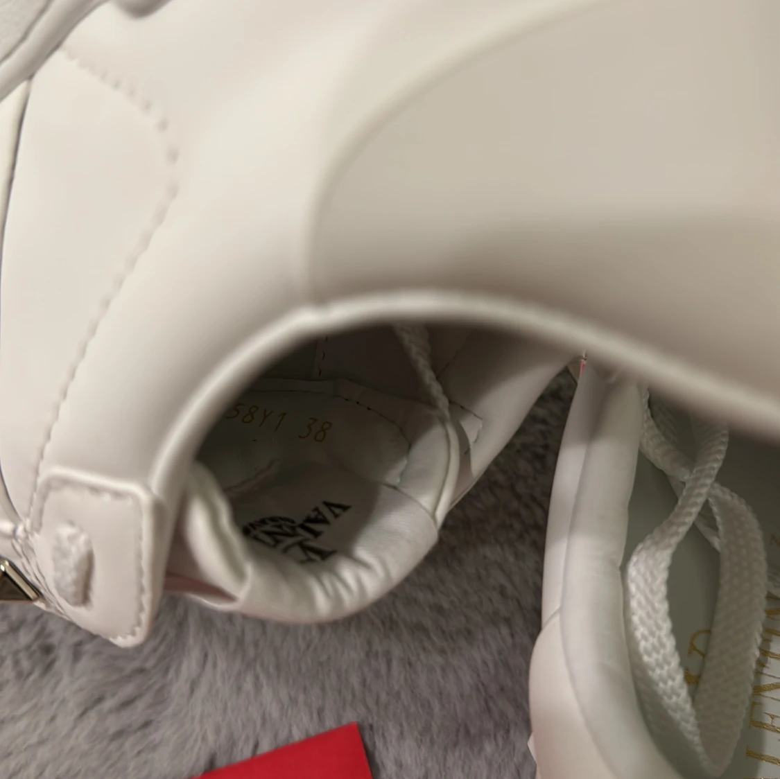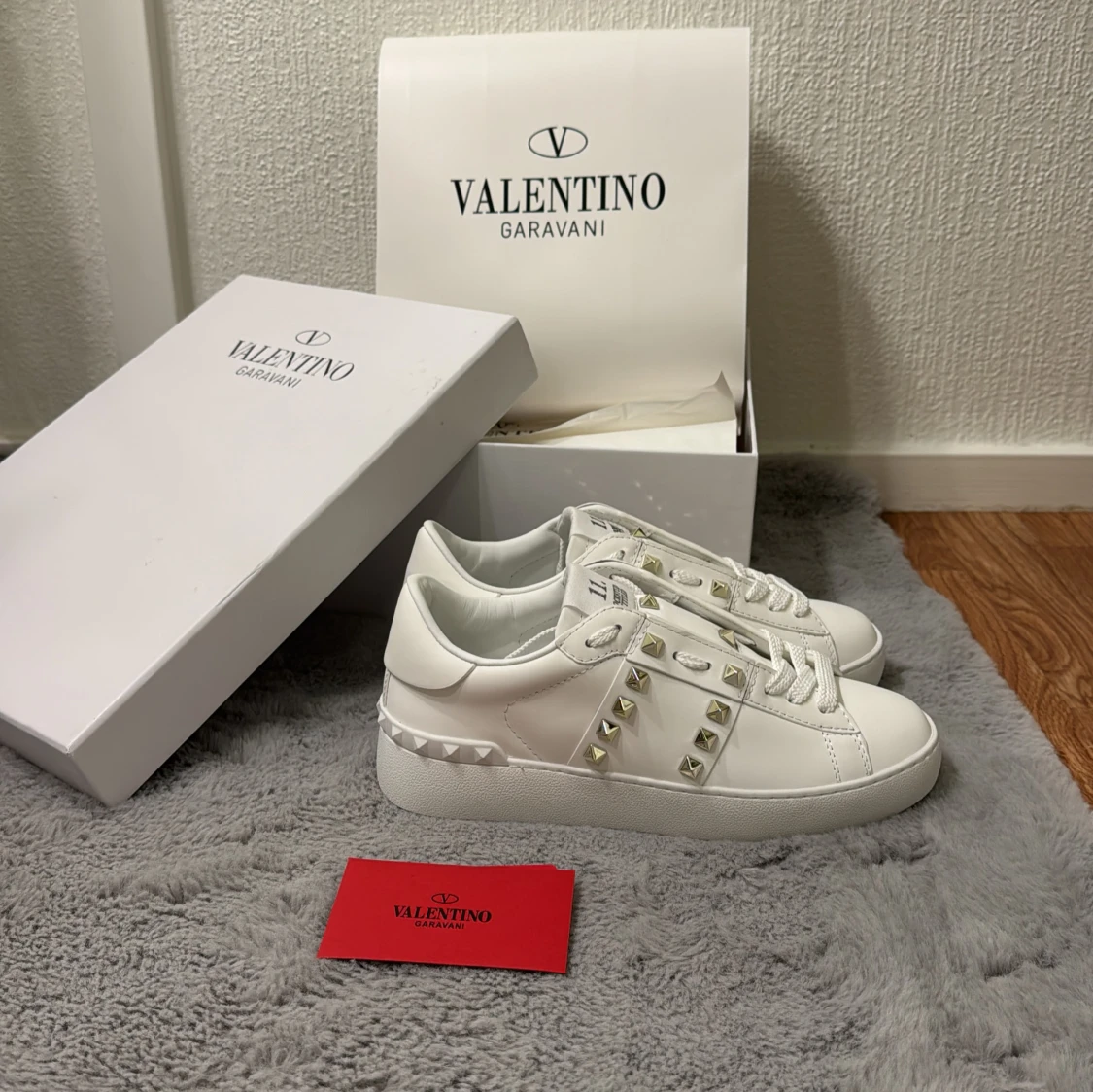 Snygga vita Valentino Rockstud sneakers i skinn med ikoniska nitar i guld längs sidorna och bak på sulan. Klassisk rund tå, snörning och platt sula. Perfekta för dig som vill ha en lyxig och trendig look med edge.