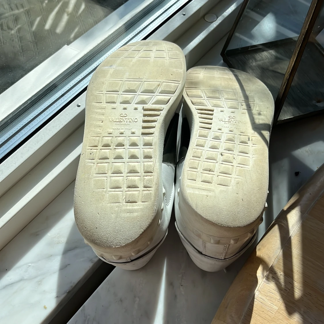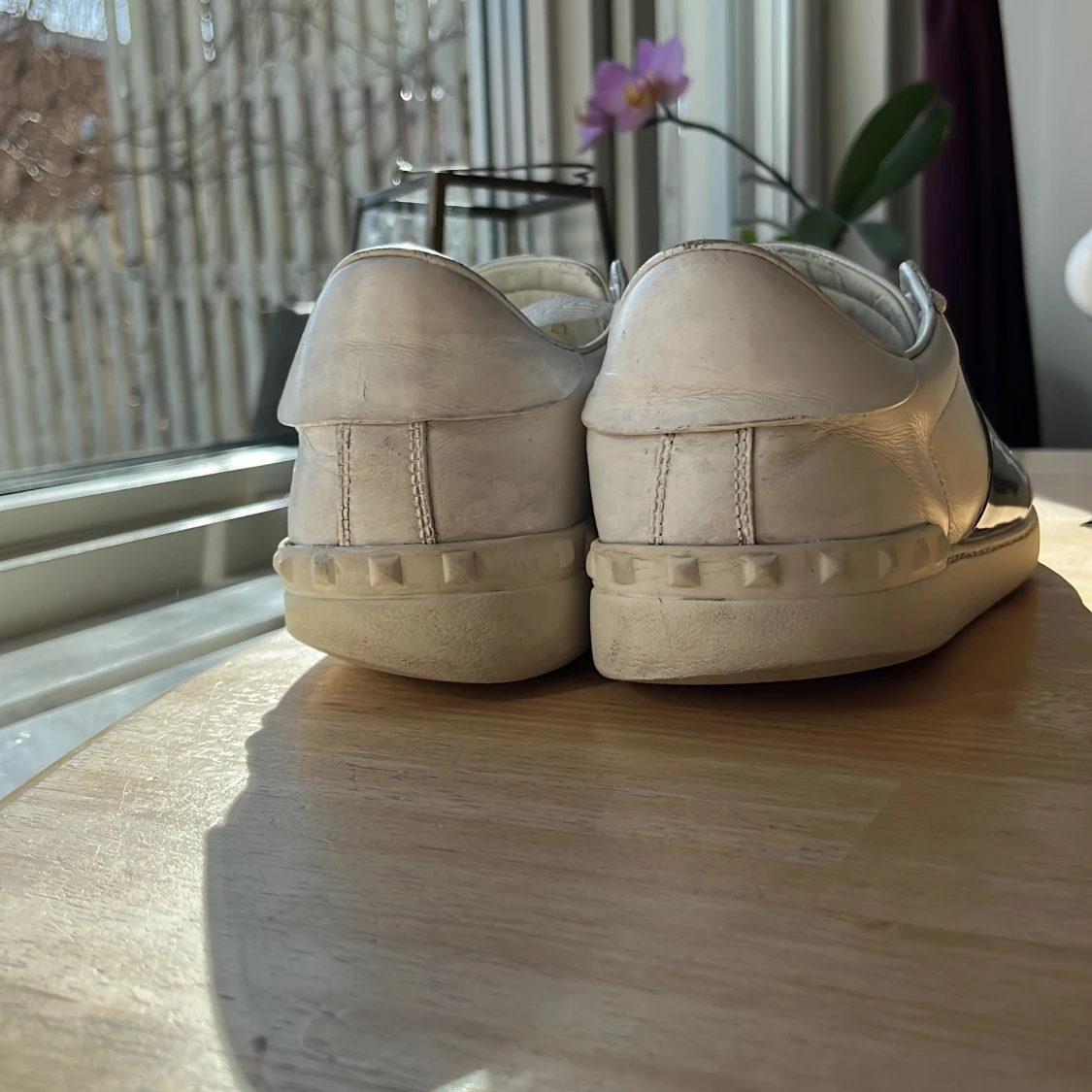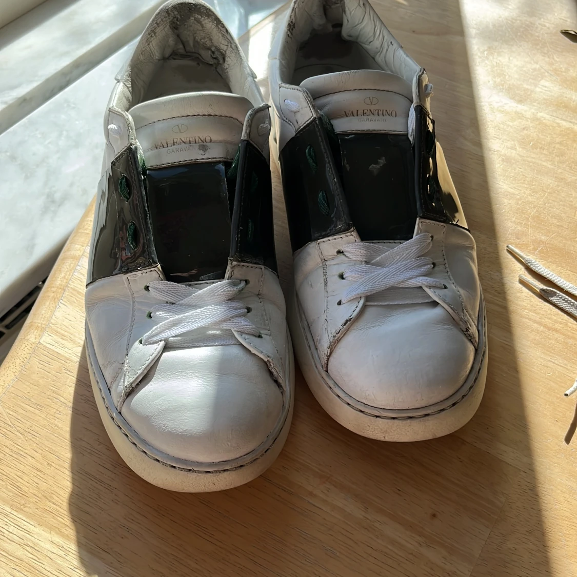 Snygga Valentino open sneakers med grön glansig rand. Skorna är självklart äkta och og snören tillkommer. skicket på skorna får ni avgöra utifrån bilder och om ni vill ha några fler bilder är det bara att fråga. Jag tar gärna emot biten men kan även sälja skorna för ett bra pris vid intresse. Skorna är i storlek 42,5 men kan även passa 43 och 43,5 Har ni några som helst ytterligare frågor är det bara att slänga iväg ett meddelande så svarar jag ofta väldigt fort. Med vänliga hälsningar Oscar