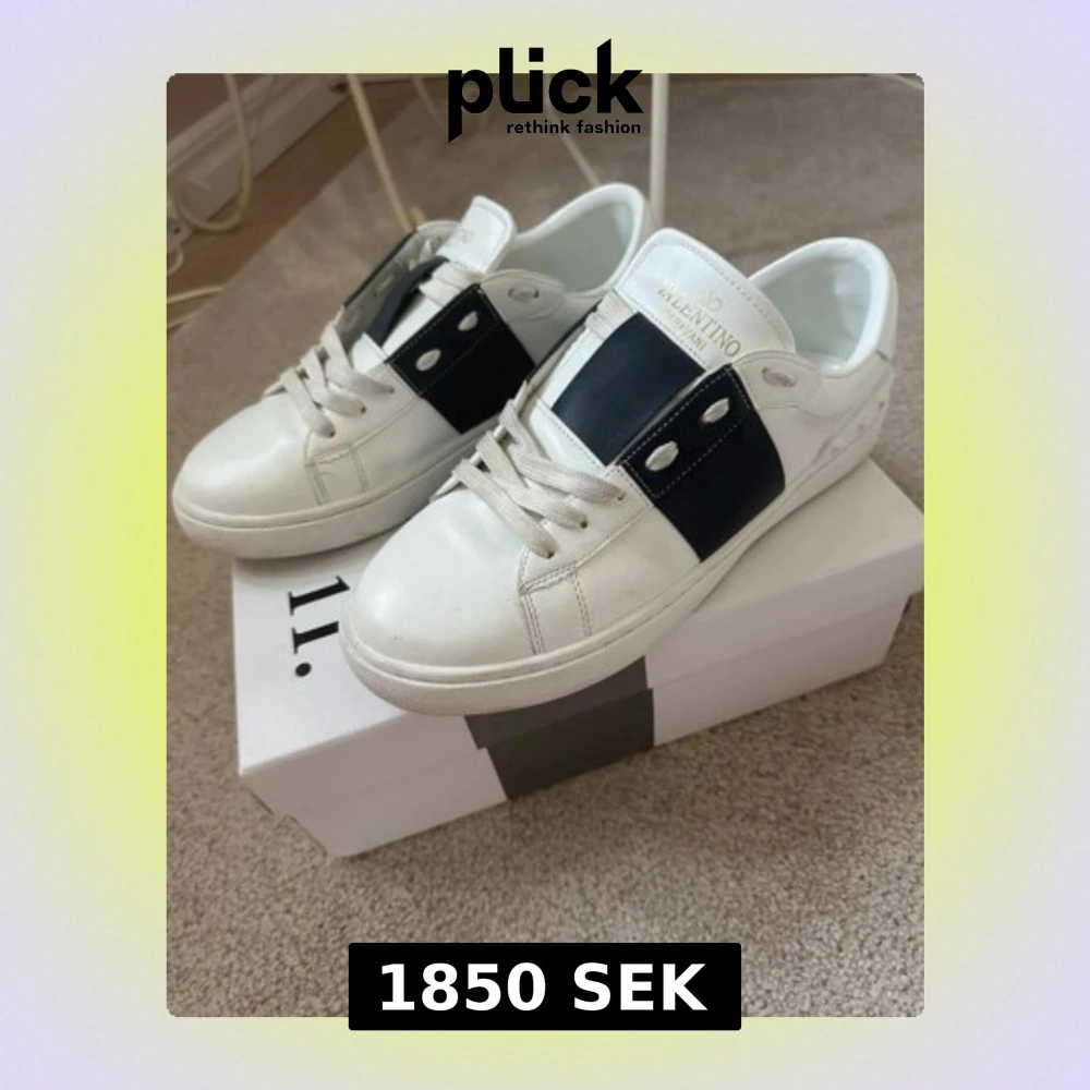 Snygga vita sneakers från Valentino Garavani med bred marinblå detalj över sidan och vita nitar baktill. Skorna har snörning, rund tå och är tillverkade i skinn. Perfekta för dig som vill ha en clean men lyxig look.