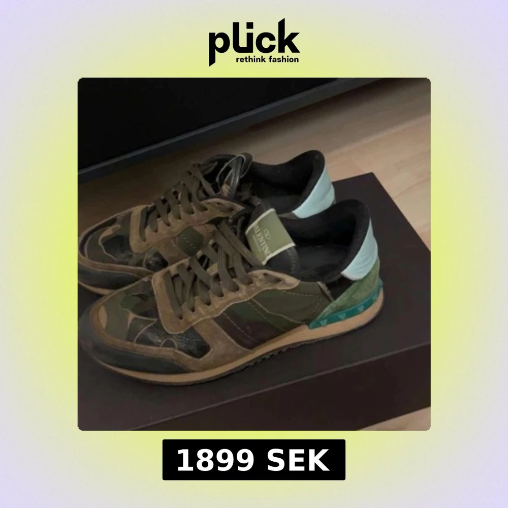 Snygga Valentino Rockrunner sneakers i ett coolt camouflage-mönster. Skorna har en mix av gröna och bruna nyanser med svarta detaljer och en ljusblå häl. Perfekta för en trendig look. Riktigt feta valentinos på marknaden🙌