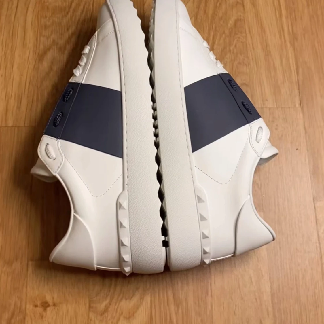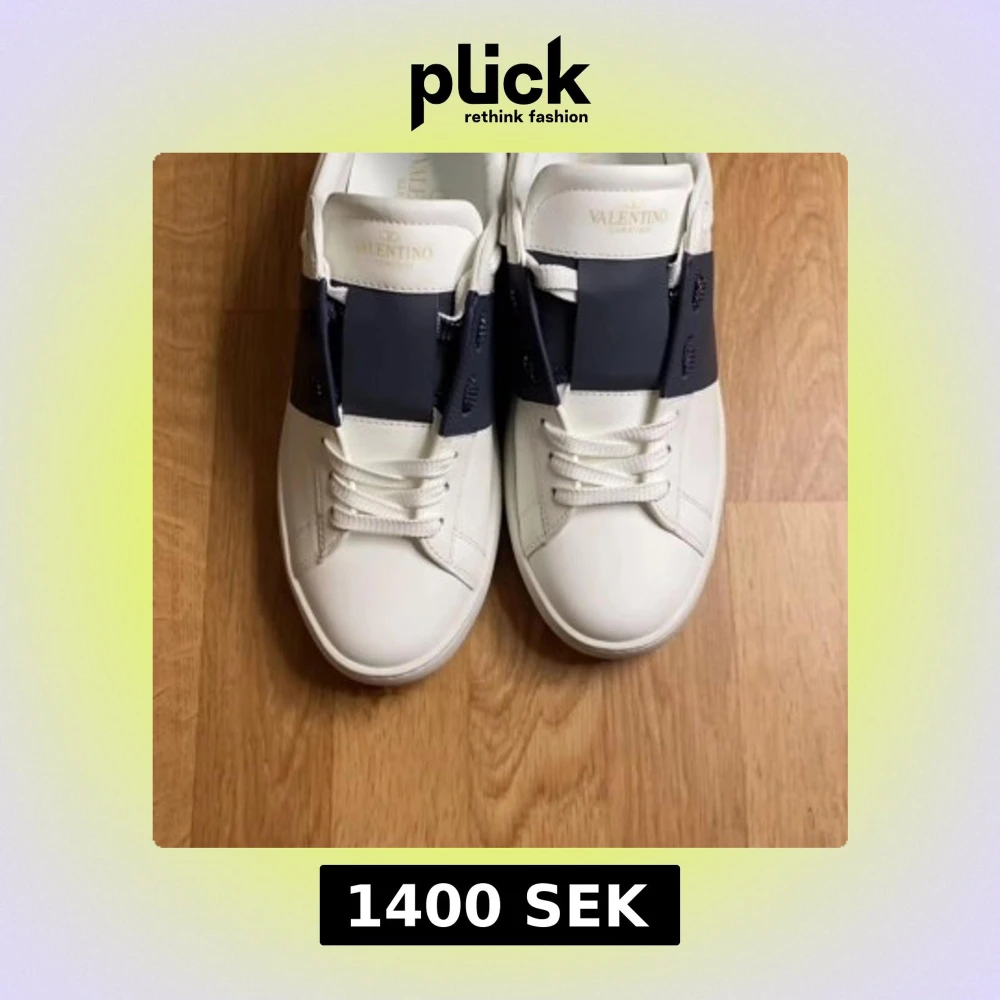 Snygga Valentino Garavani Open sneakers i vitt skinn med bred marinblå rem över vristen. Klassisk rund tå, vita snören och coola nitar på sulan. Perfekta för dig som vill ha en stilren men ändå unik look.