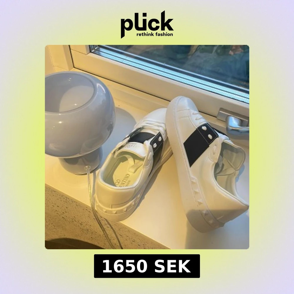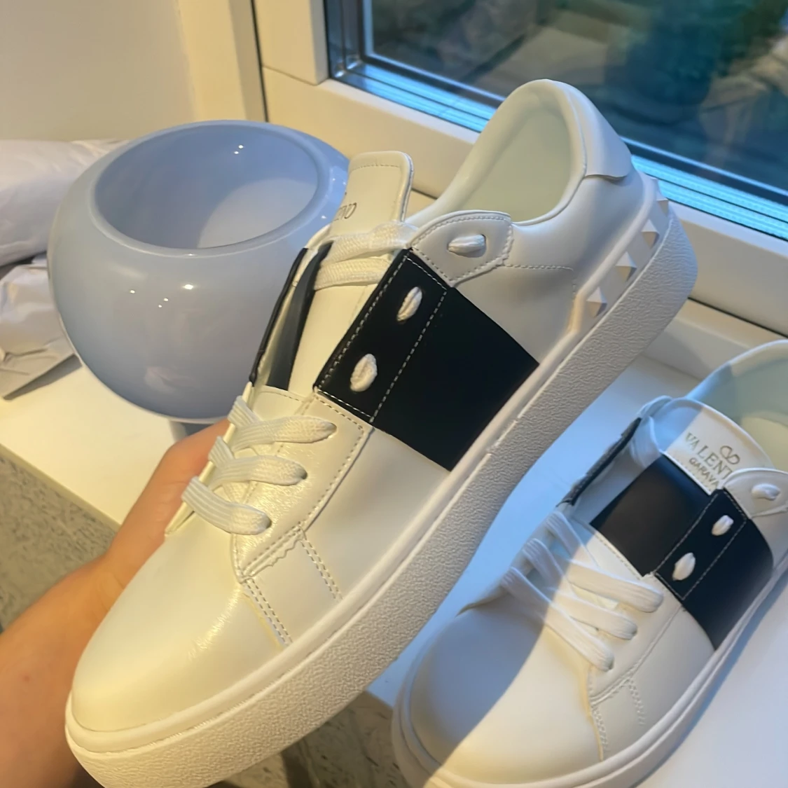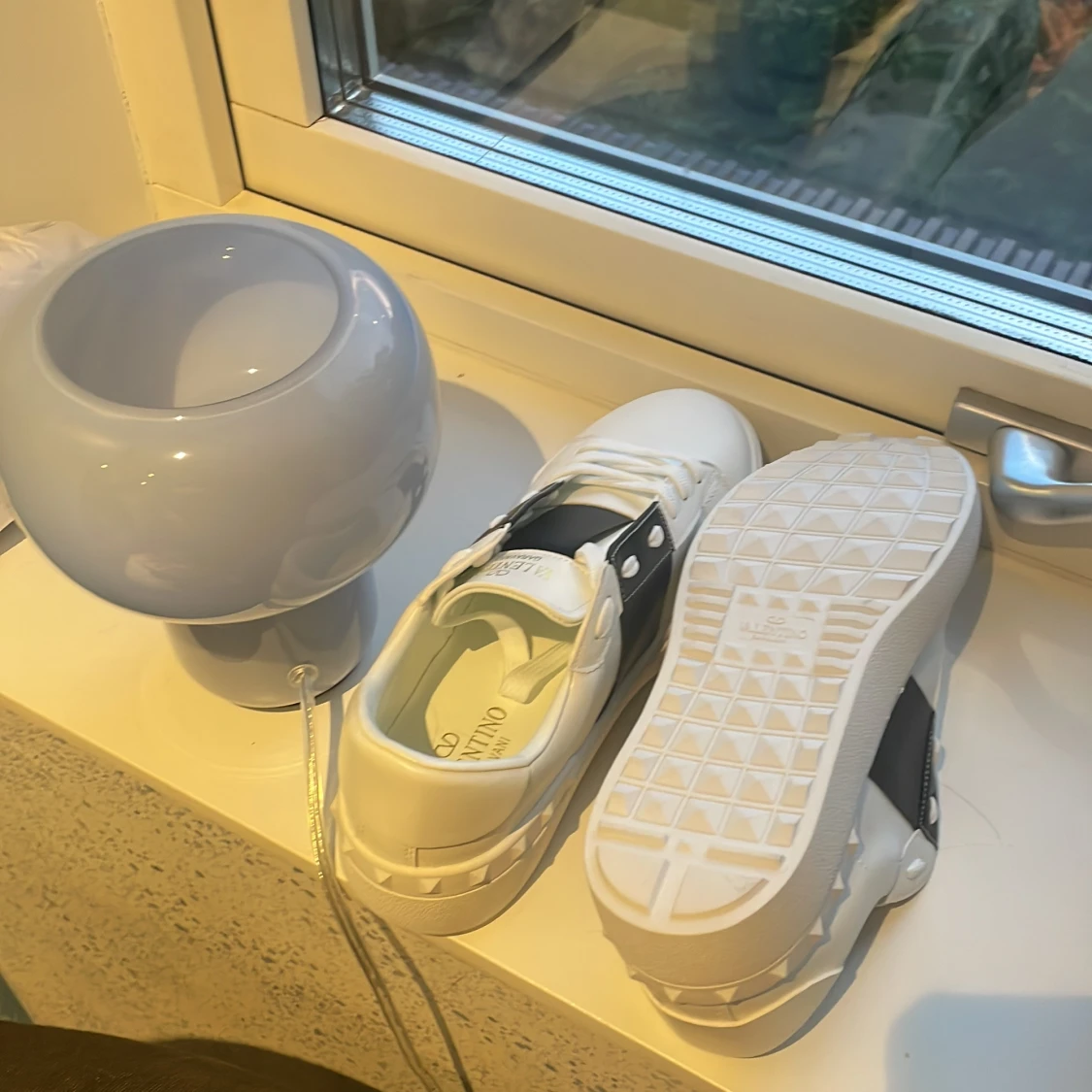 Snygga vita sneakers från Valentino Garavani med svart band och nitar på hälen. Skorna har rund tå, platt sula och klassisk snörning. Tillverkade i skinn för en lyxig känsla och stilren look. Perfekta för dig som vill sticka ut med exklusiva detaljer.