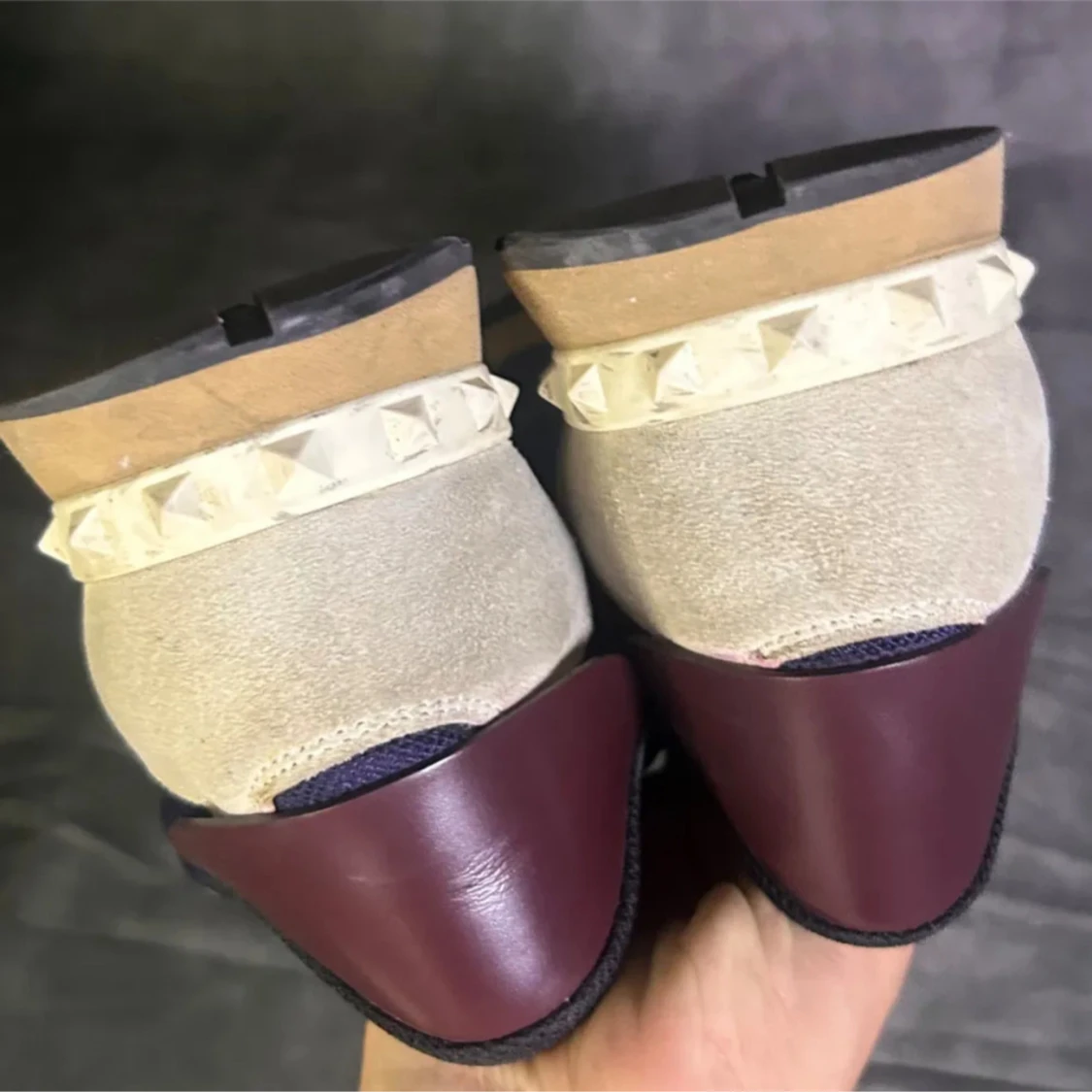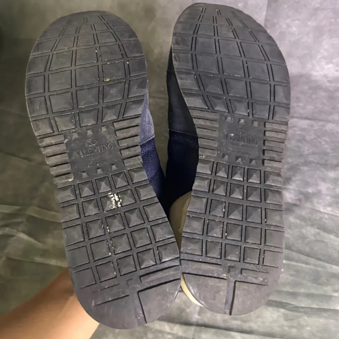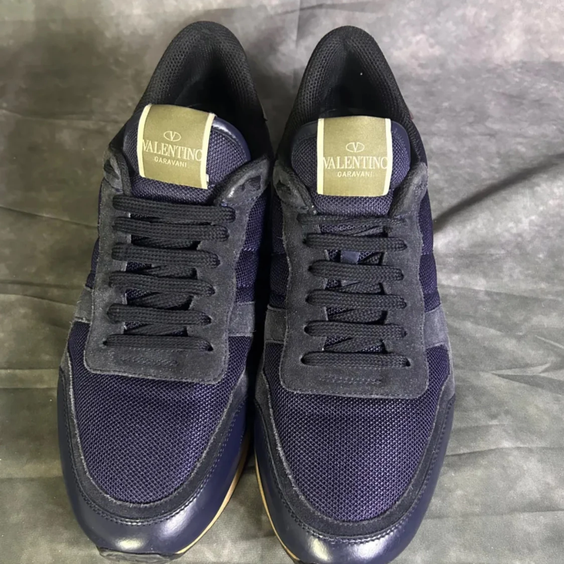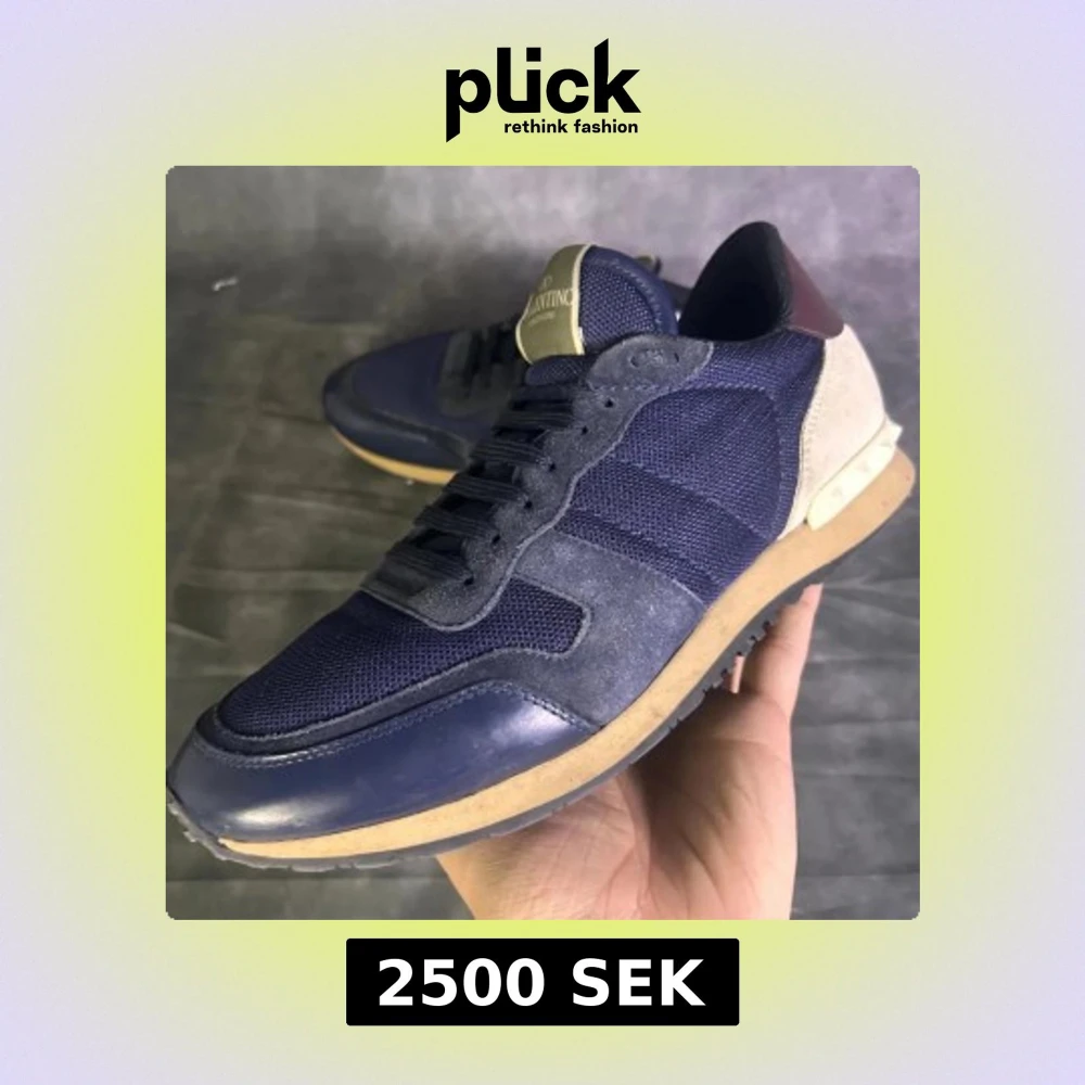 Snygga Valentino Rockrunner sneakers i mörkblå mesh och mocka med detaljer i beige mocka och vinrött skinn på hälen. Sulan är beige och har coola pyramidnitar bak. Klassisk rund tå och svart snörning. Perfekt för dig som gillar exklusiva sneakers med unik design. Skriv om ni har frågor