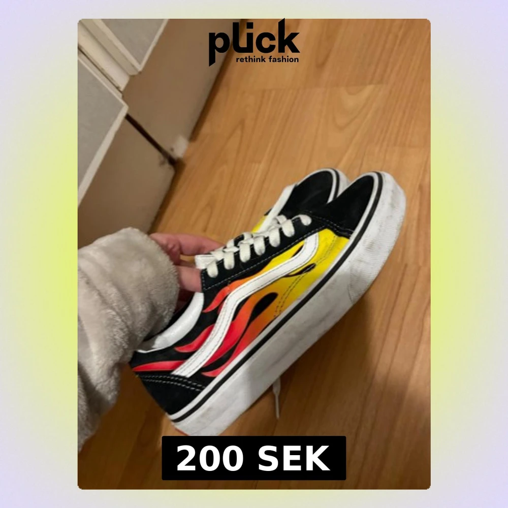 Säljer ett par Vans Old Skool sneakers med grymt flame-mönster i rött, orange och gult på sidorna. Perfekt för dig som vill sticka ut med coola färger och streetstyle. Endast använda ett fåtal gånger.