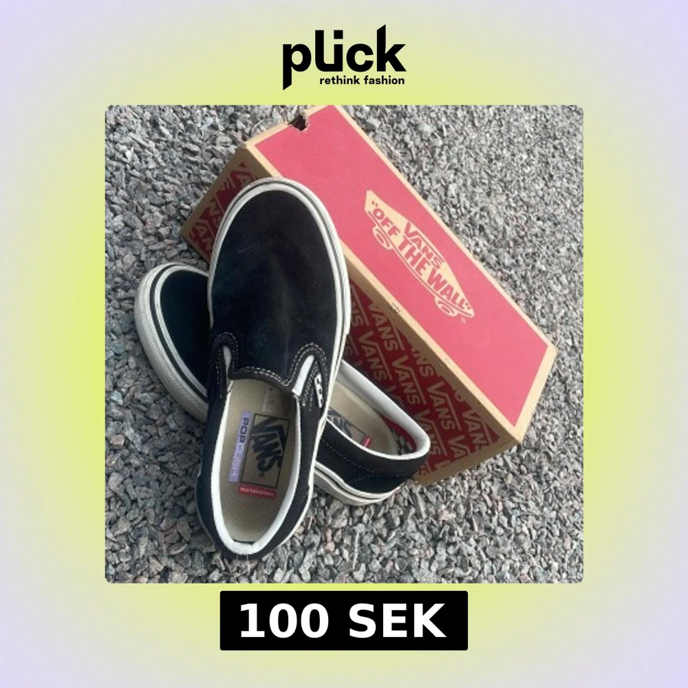 Klassiska svarta slip-on sneakers från Vans med vit sula och diskret rutigt mönster på insidan. Skorna har en enkel design med elastiska sidor för enkel påtagning och en liten rutdetalj vid sidan.