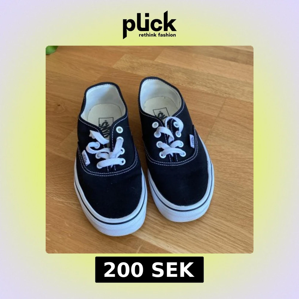 Klassiska svarta Vans sneakers med vit sula och vita snören. Skorna har tydliga kontrastsömmar och den ikoniska Vans-loggan på sidan och bak på sulan. Ovandelen är i canvas och sulan är i gummi med det klassiska rutmönstret undertill. Köpta för ca 2 år sedan och använda max 3 ggr av mig.