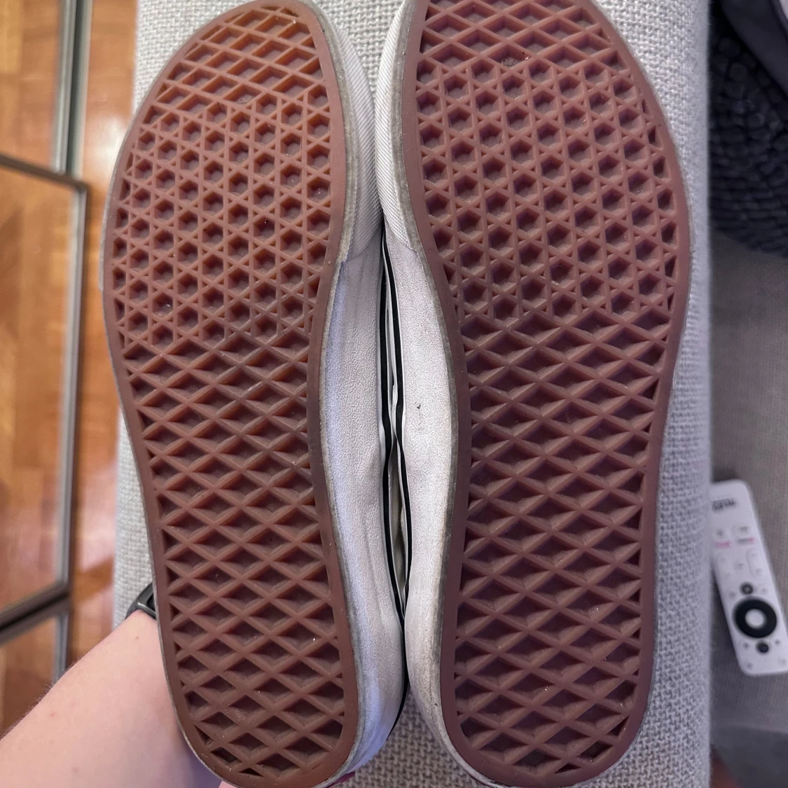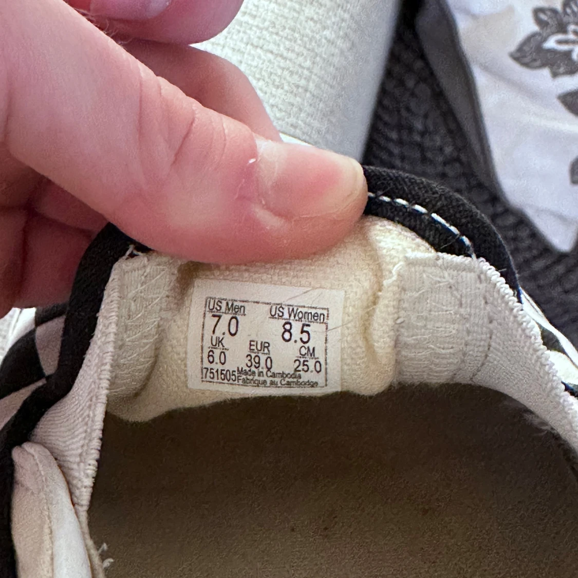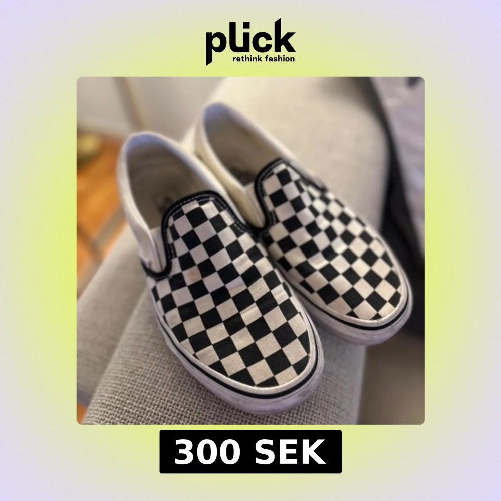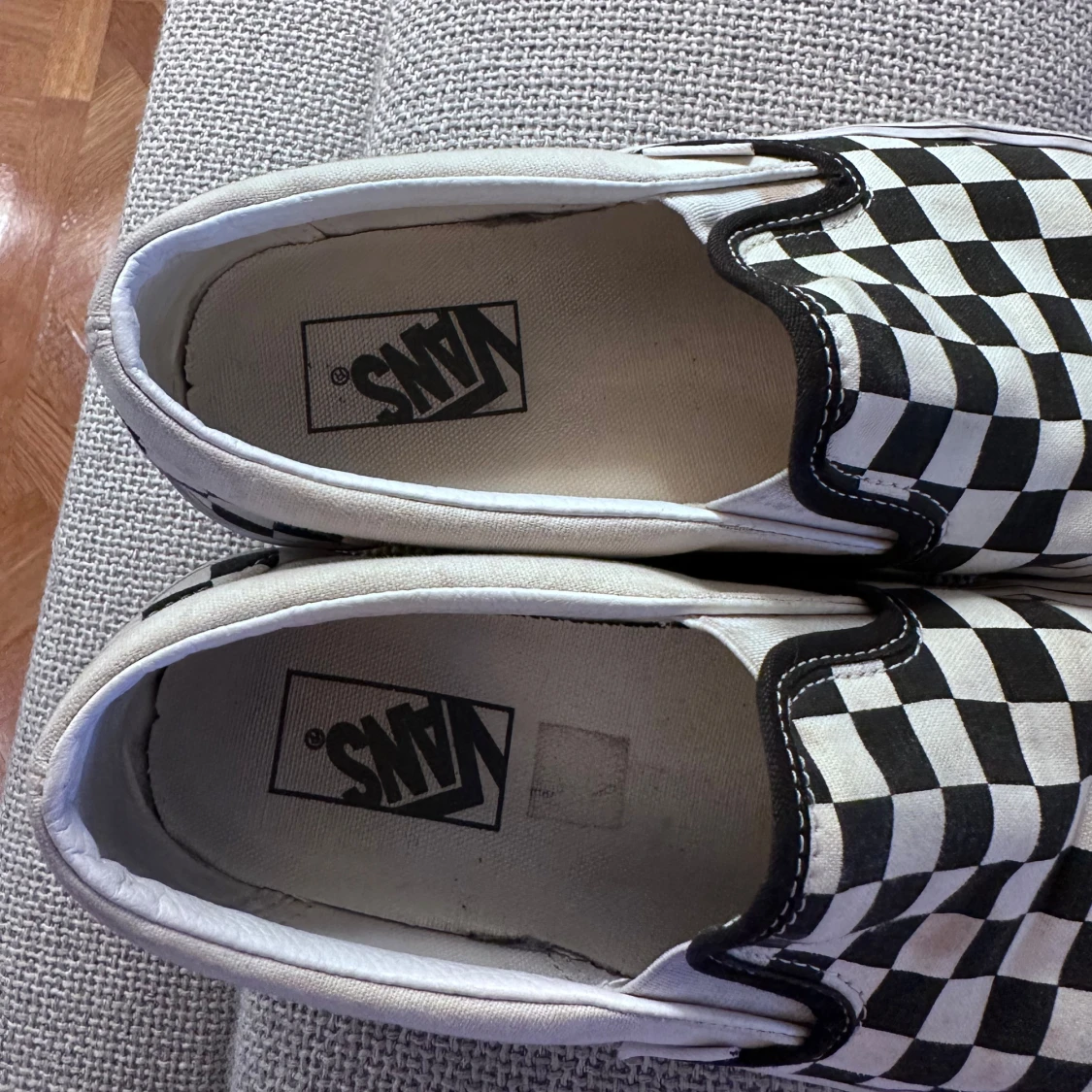Säljer ett par klassiska svartvita slip-on sneakers från Vans med ikoniskt rutigt mönster. Skorna har en bekväm passform och är perfekta för en avslappnad stil.