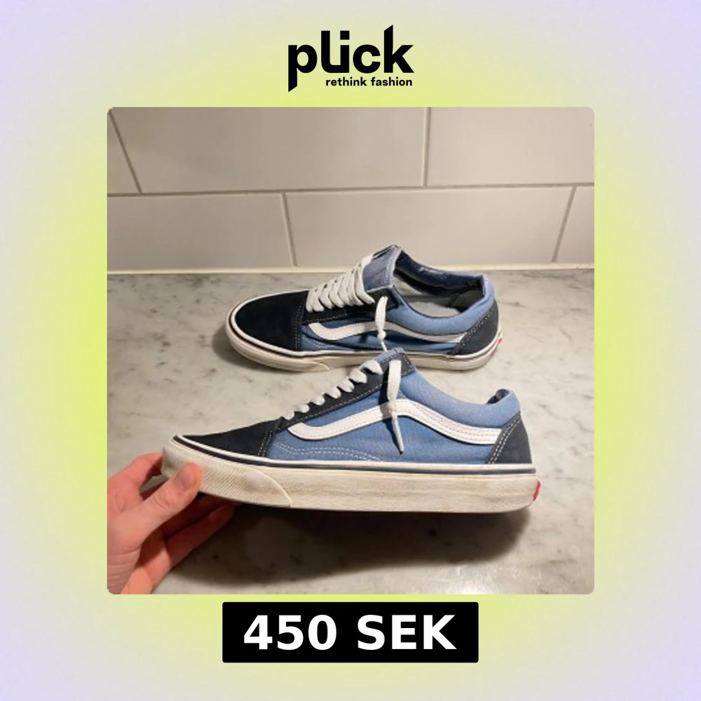Snygga Vans sneakers i en kombination av mörkblått och ljusblått med vita detaljer. Skorna har klassisk snörning och en vit sula med det ikoniska våffelmönstret undertill. Perfekta för en avslappnad stil.