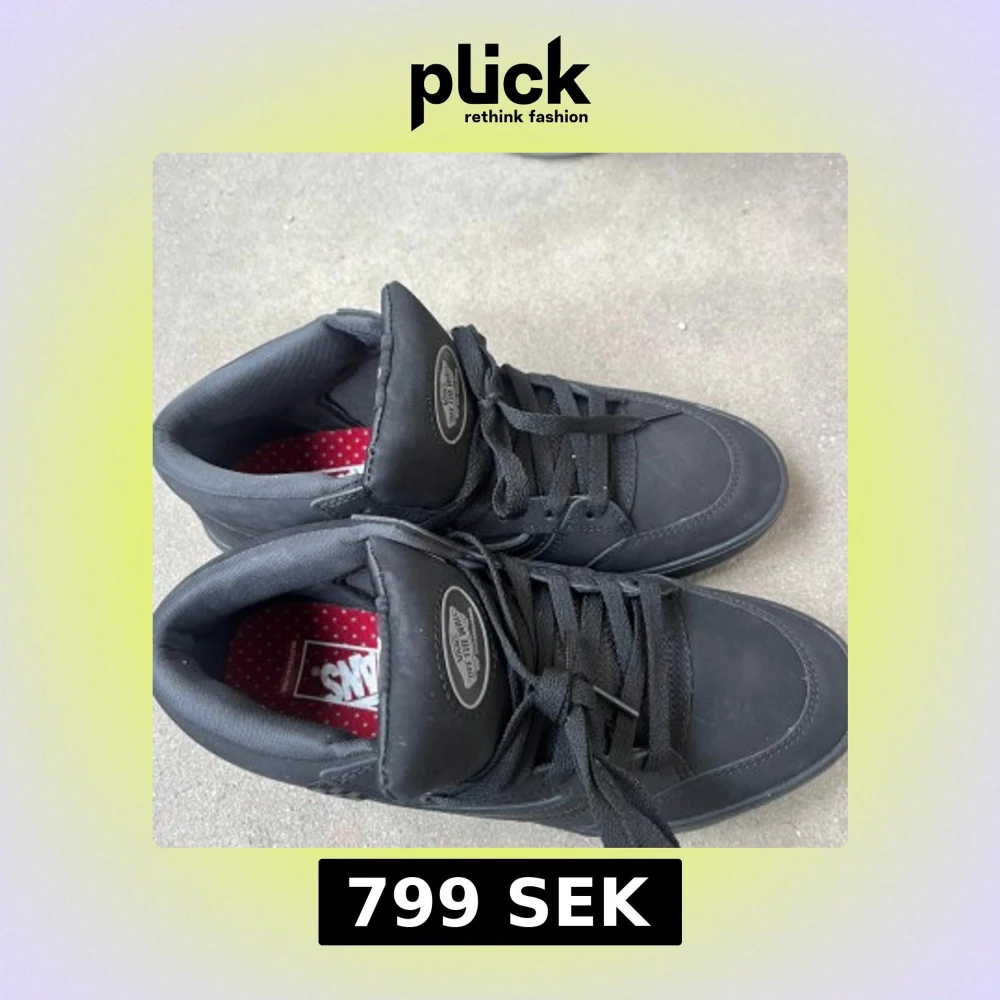 Säljer ett par svarta Vans Zahba Mid sneakers med klassisk Vans-logga på plösen och svart snörning. Skorna har en röd innersula med vita prickar och en slitstark, mönstrad yttersula. Perfekta för skate eller vardagsstil.