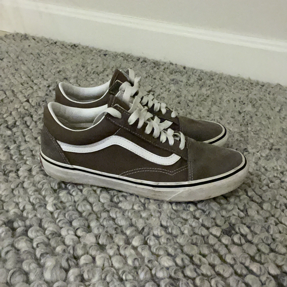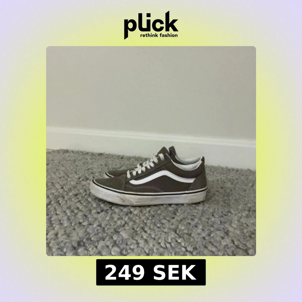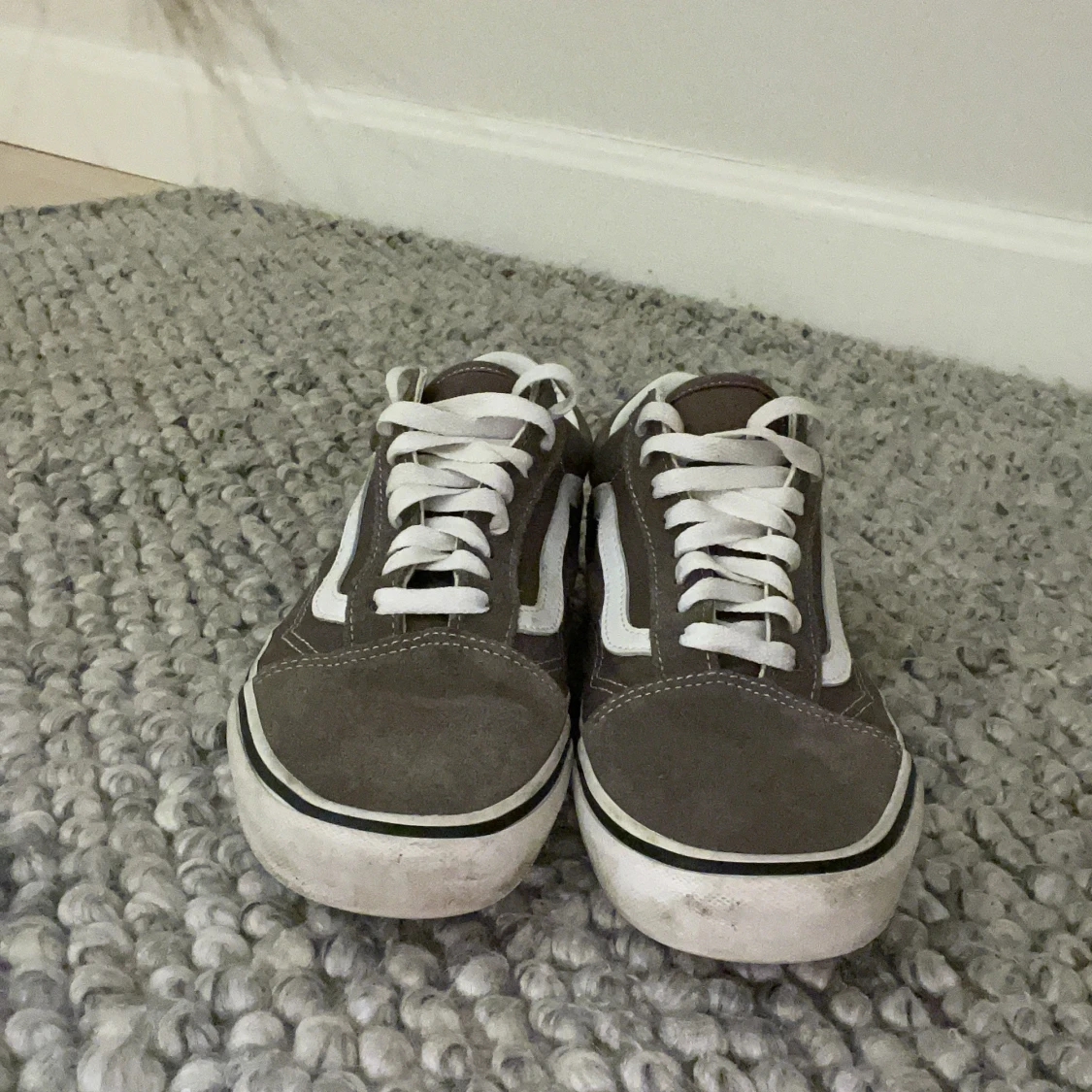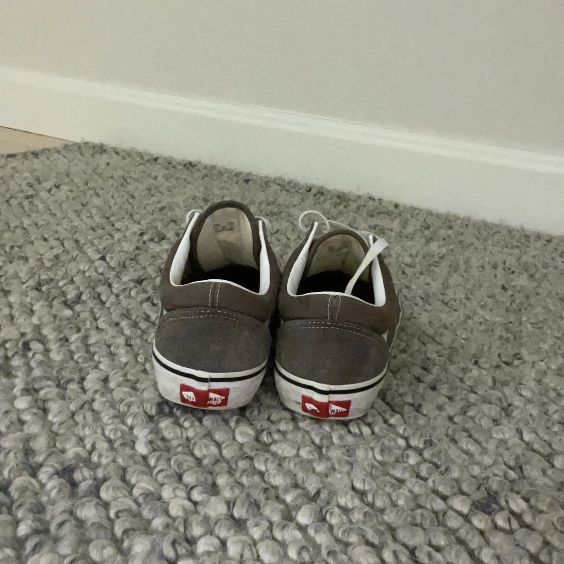 Säljer ett par klassiska Vans Old Skool sneakers i brun mocka och canvas med vita detaljer och snörning. Skorna har den ikoniska vita sidolinjen och platt sula. Perfekta för en avslappnad streetstyle-look. Anvönad bara et få tal gånger priset går stt diskutera ☺️