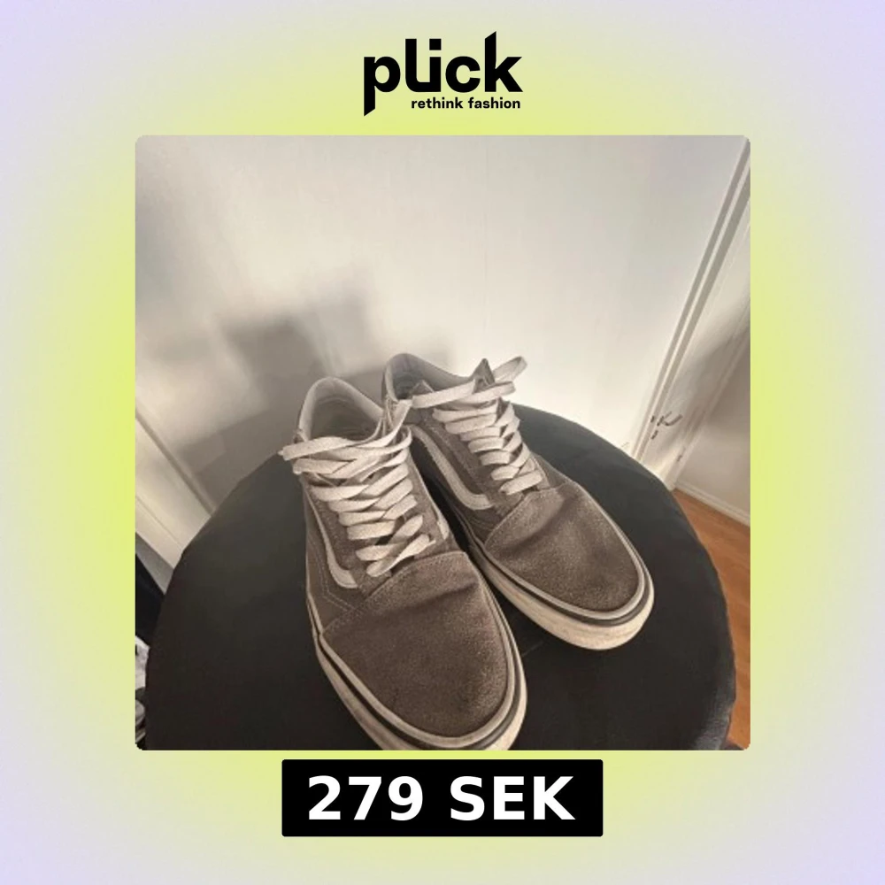 Säljer ett par klassiska Vans Old Skool sneakers i grå mocka med vit sula och vita snören. Skorna har den ikoniska vita sidoremsan och rund tå. Perfekta för en avslappnad streetstil och passar till det mesta. Kan skicka på post samt mötas i Stockholm👍😁