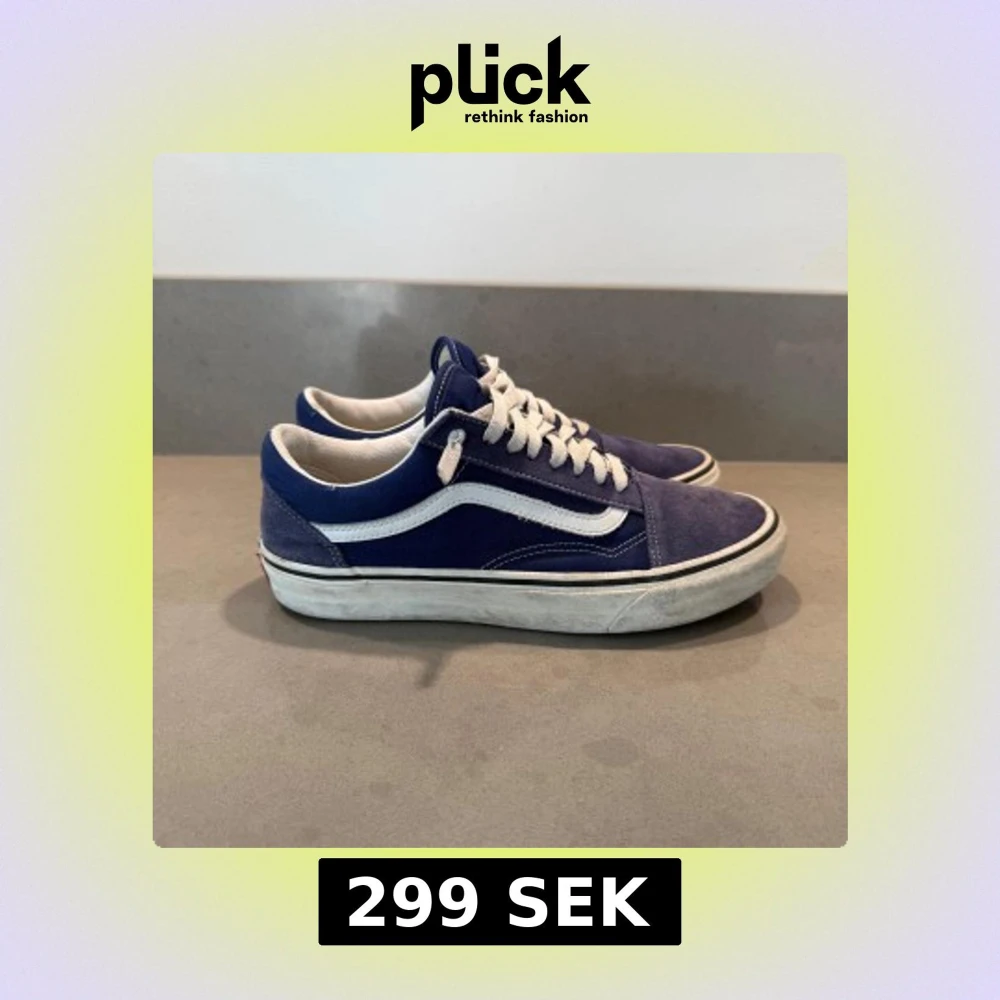 Säljer ett par klassiska Vans sneakers i mörkblått med vit sidorand och vita snören. Skorna har en platt sula och rund tå, med ovandel i mocka. Perfekt för dig som gillar en clean look.