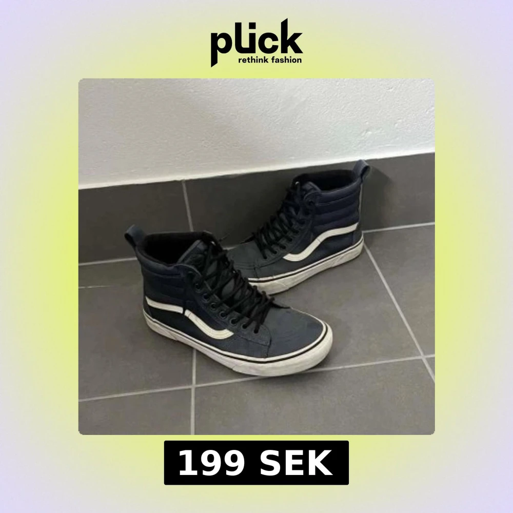 Säljer ett par klassiska Vans Sk8-Hi sneakers i mörkblå med vit sula och vit sidostripes. Höga sneakers med snörning och rund tå, tillverkade i slitstarkt canvas och skinn. Perfekt för dig som gillar streetstyle och vill ha en ikonisk look. Storlek 42