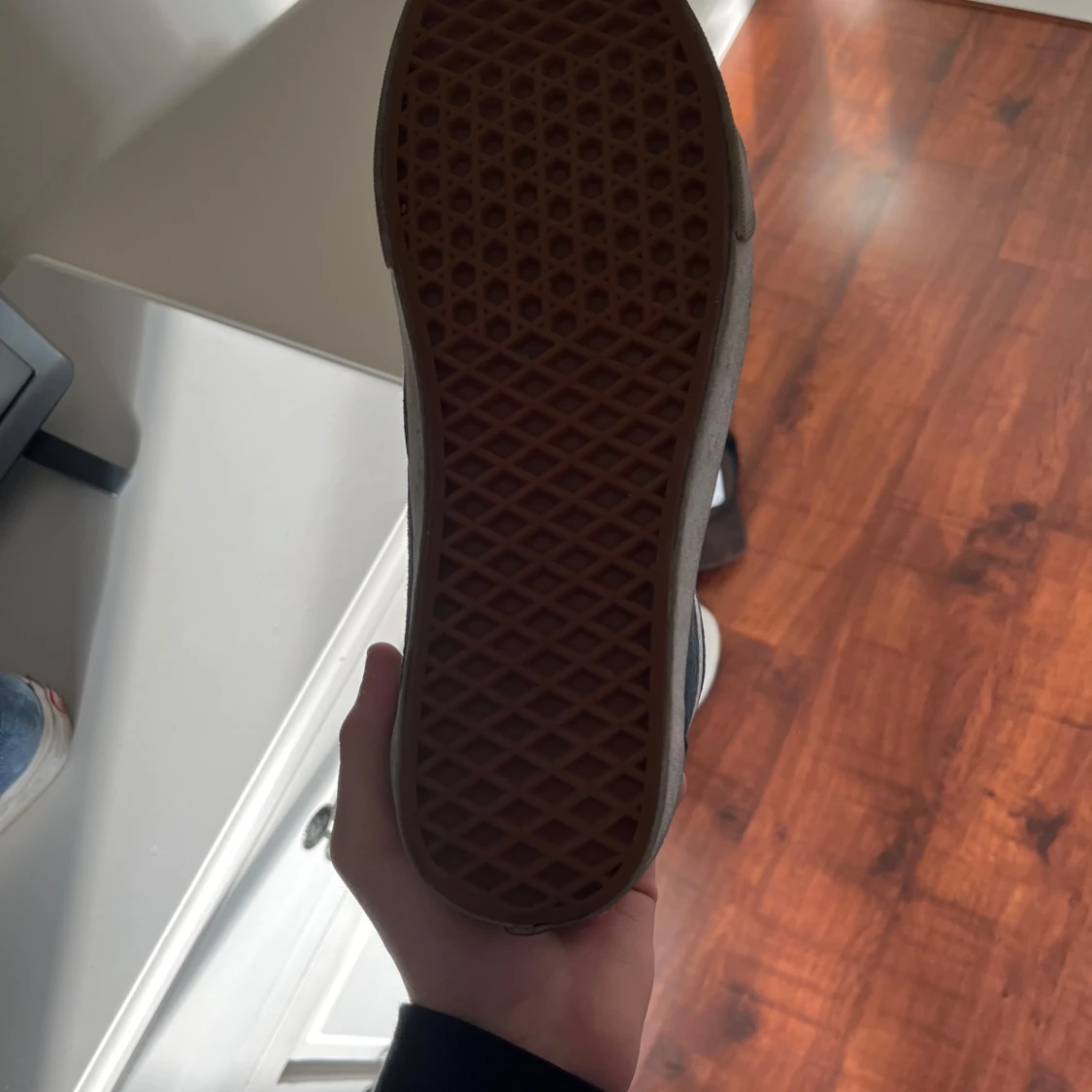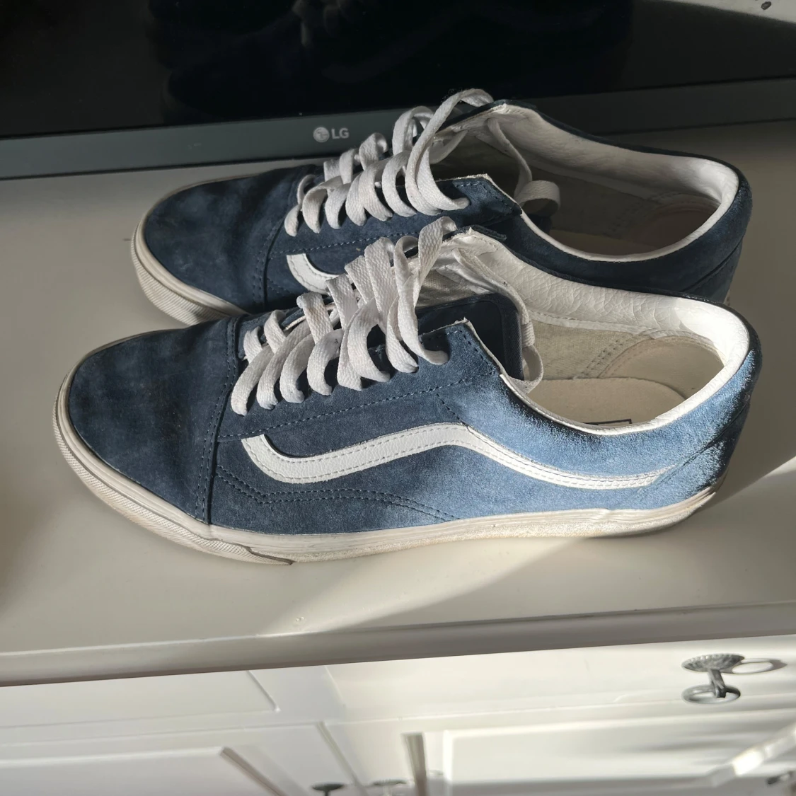Säljer ett par klassiska blå Vans sneakers i mocka med vit sula och snörning. Är i bra skick med lite slitage på sulan. Perfekta för vardagsbruk och ger en skön, avslappnad stil. Passar bra till både jeans och shorts!