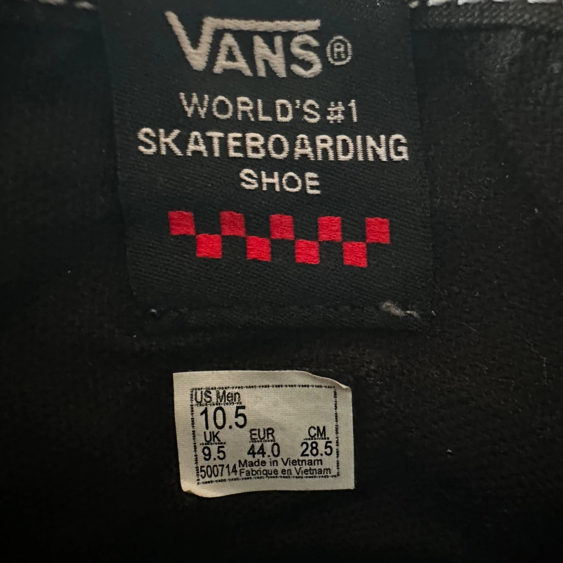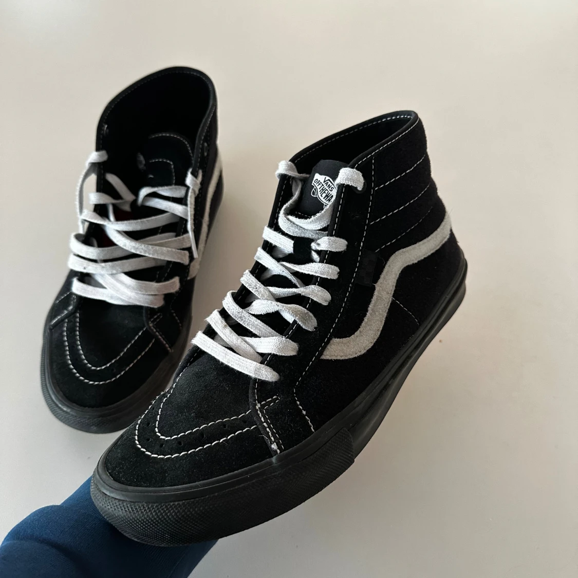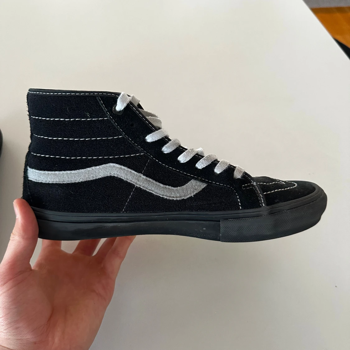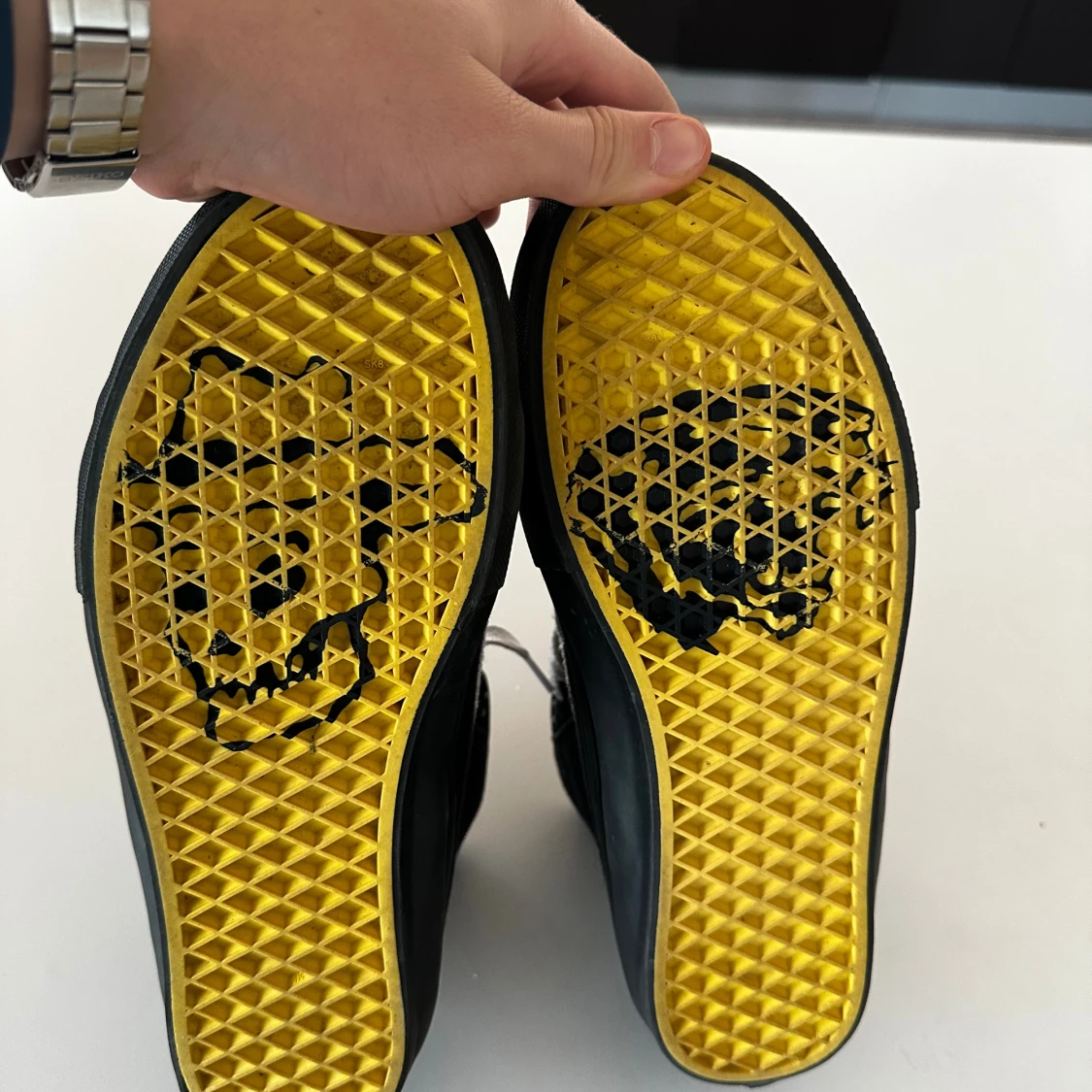 Säljer ett par Vans Sk8-Hi sneakers i svart mocka med vita detaljer och snörning. Klassisk vit sidostrip och kontrastsömmar. Yttersulan är gul med svart mönstertryck undertill, vilket ger en unik look. Perfekta för dig som gillar streetstyle och vill sticka ut.