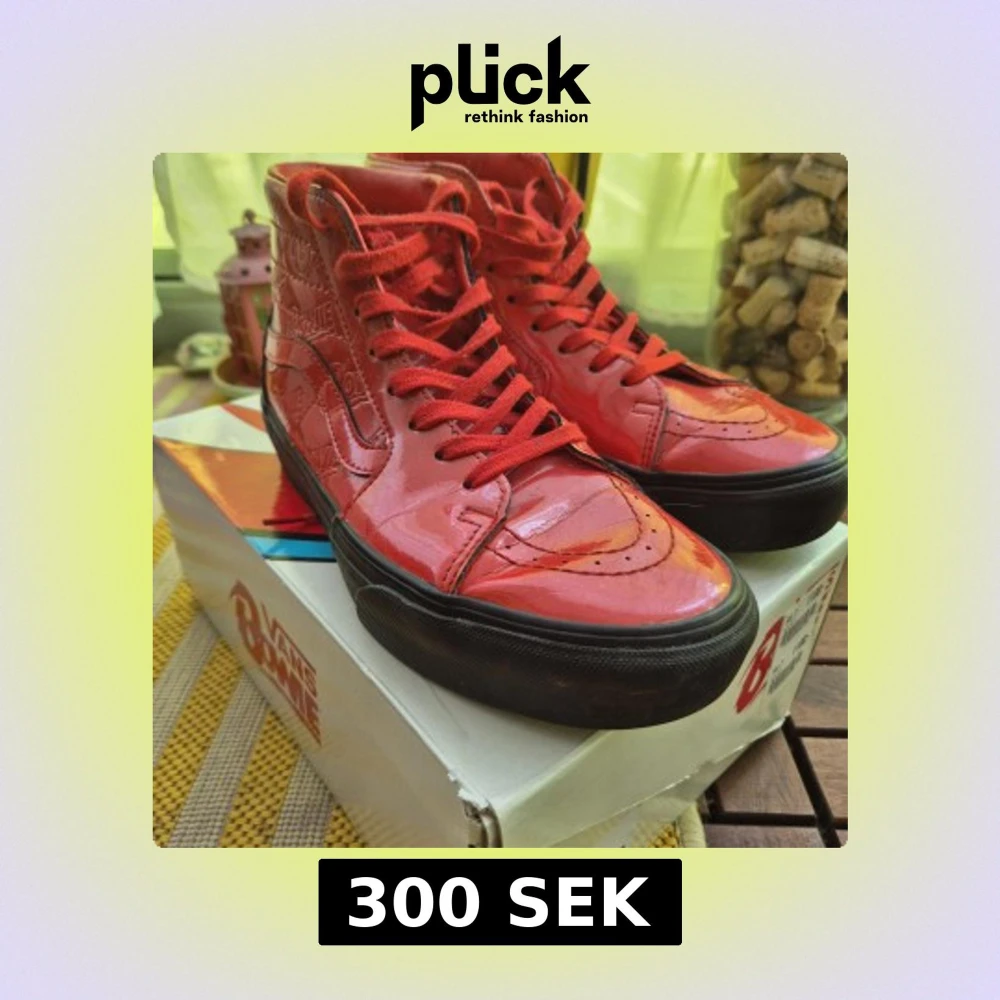 Unika Vans x David Bowie sneakers i rött skinn med präglat Bowie-mönster över hela skon. Klassisk Vans high-top modell med svarta gummisulor och röda snören. Snygg och cool design för dig som gillar statement pieces och musikikoner.