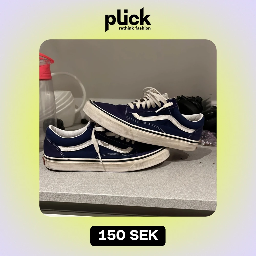 Säljer ett par klassiska blå Vans sneakers med vit sula och snörning. Skorna har den ikoniska vågiga sidodetaljen i vitt och är perfekta för en avslappnad stil. Skorna är i fint skick tycker jag men det ända är att den här röda Vans loggan på hälen är lite sliten på båda skorna men annars ett par riktigt snygga skor