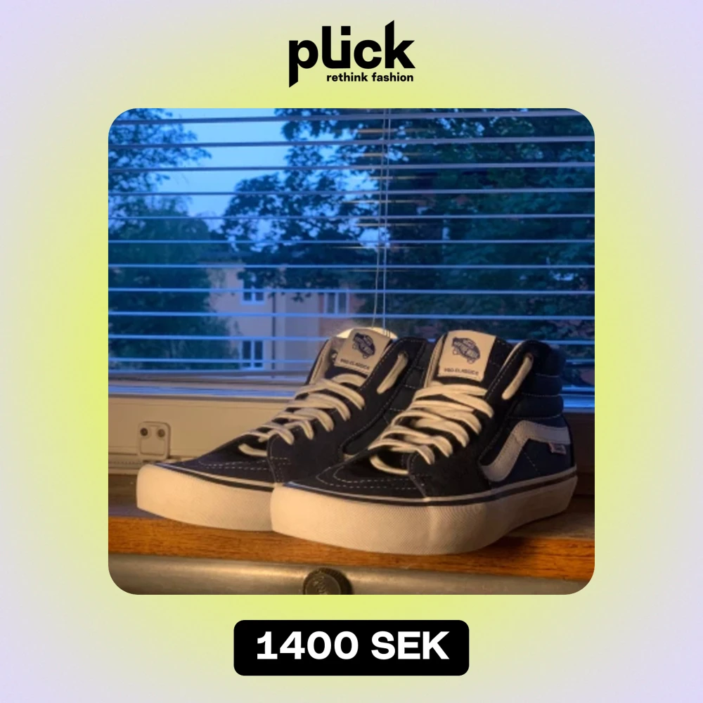 Säljer ett par snygga Vans Pro Classics Sk8-High sneakers i mörkblått och vitt. Skorna har en klassisk design med den ikoniska vågiga sidostripen och 'Off the Wall'-loggan på hälen. De är gjorda i slitstarkt material och har en bekväm passform med snörning. Perfekta för både vardag och skate! Skorna är i nyskick.