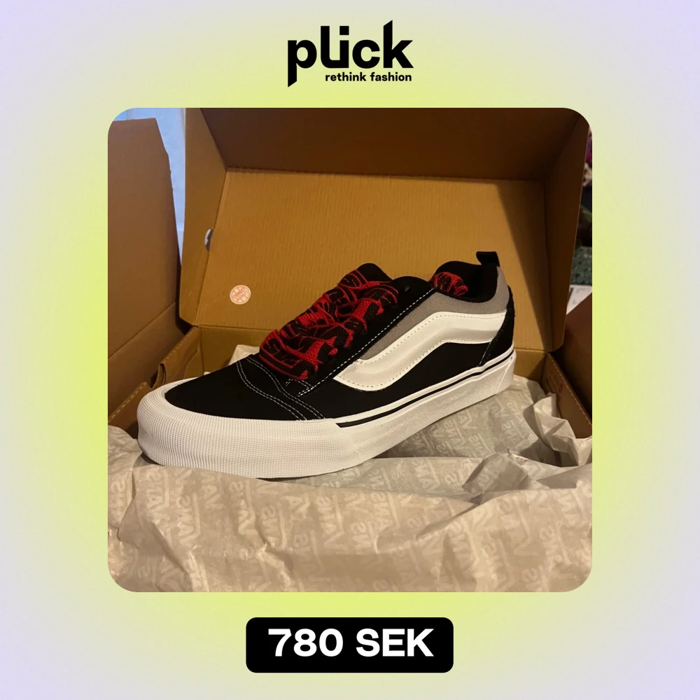Säljer ett par snygga Vans sneakers i svart och vitt med coola röda snören. Skorna är i nytt skick och kommer i originalkartong. Perfekta för både vardag och fest! 🖤