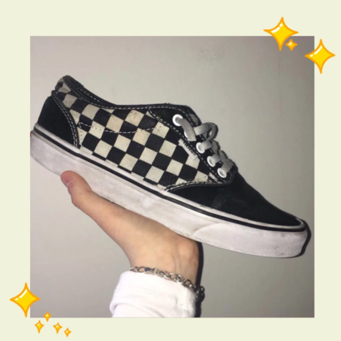 smått slitna vans med checkerboard mönster i storlek 39. skobanden bör bytas ut och insidan av själva skon har tyvärr färgats svart av skejting. kontakta för mer info!🥀