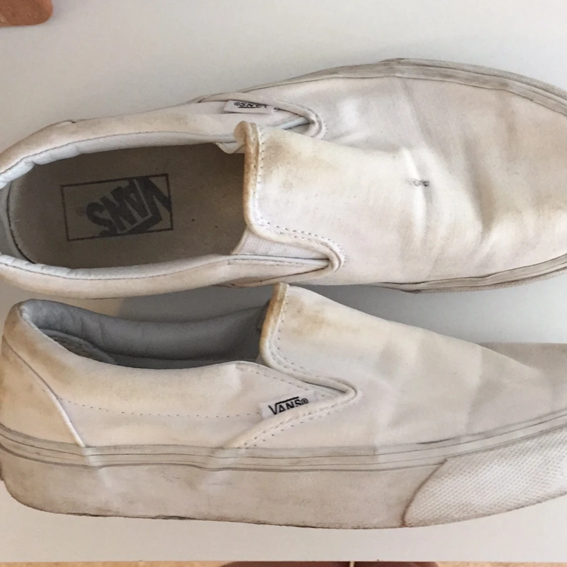 Vita Vans. Säljes billigt pga börjat bli slitna (se bild).