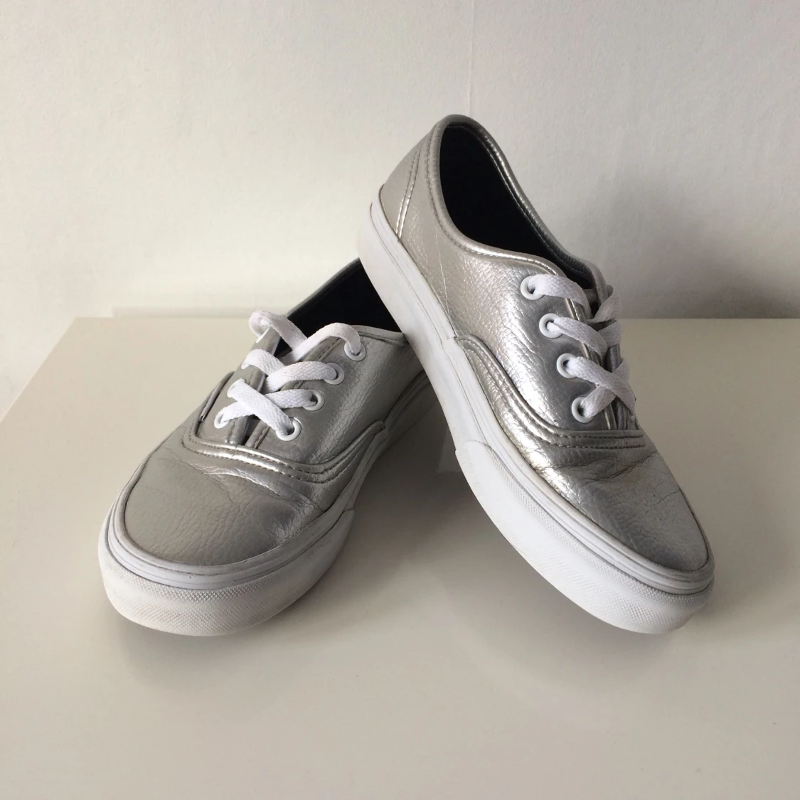 Kalasfina Vans Authentic i silverfärgad läderimitation (?). Väldigt sparsamt använda och i bra skick. Säljes pga för liten storlek, tyvärr! Frakt tillkommer.