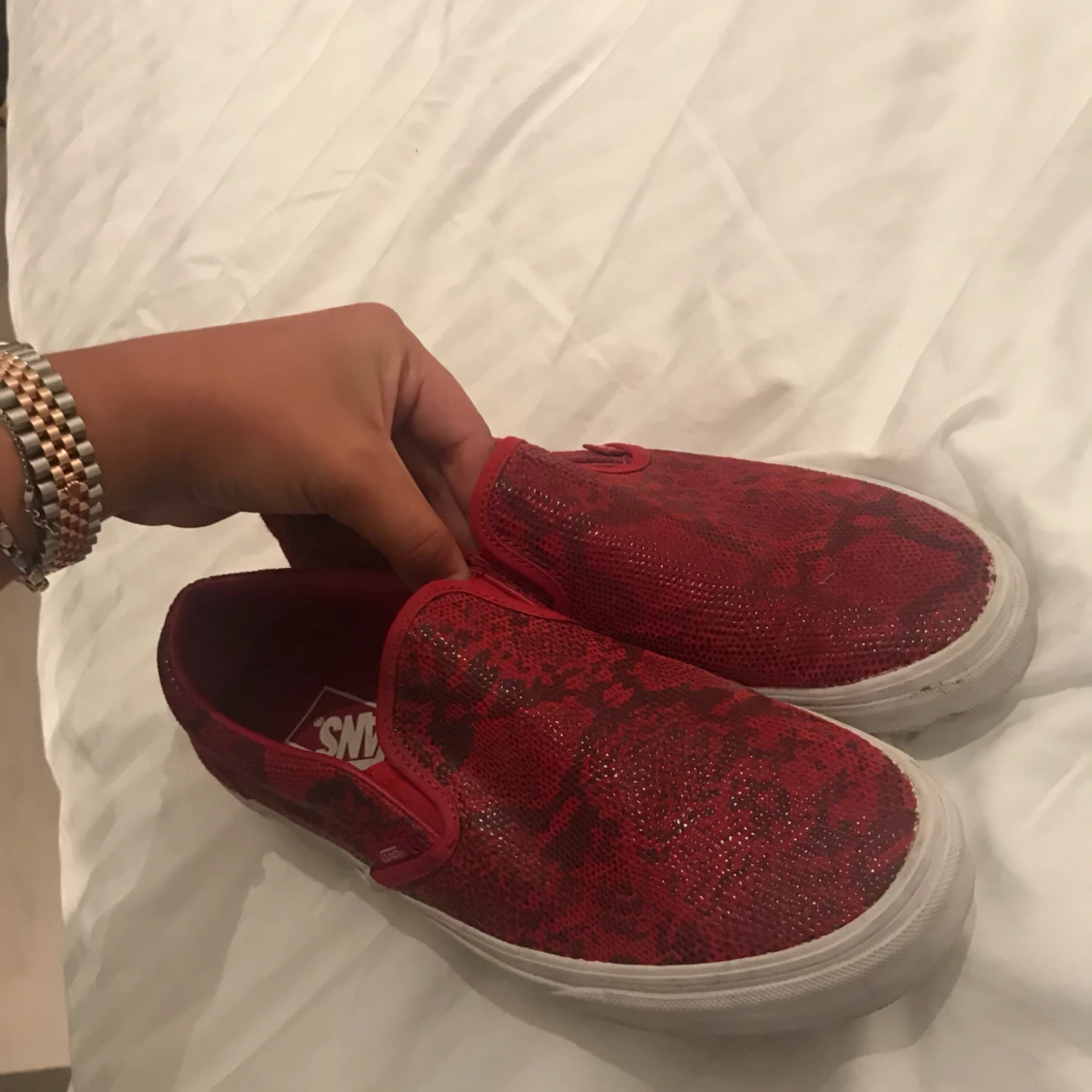 Röda Vans Snakeskin, använda 2-3 gånger. Nypris 800 kr.