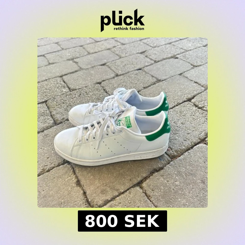Klassiska vita Adidas Stan Smith sneakers med gröna detaljer. Knappt använda pga för stora för mig! Storlek: 41 2/3, skulle säga att det är typ 41