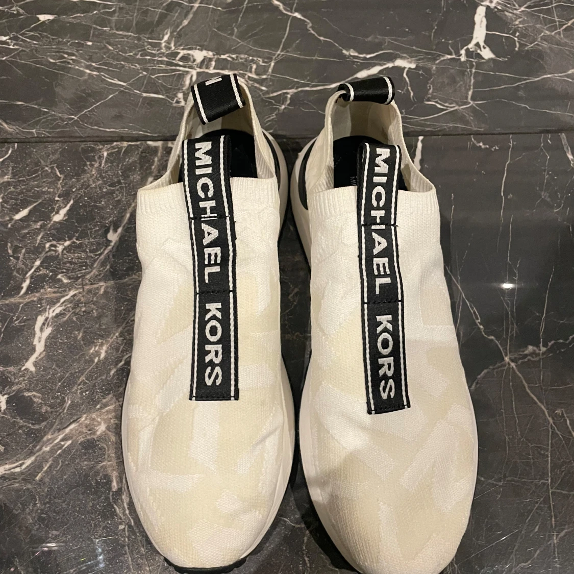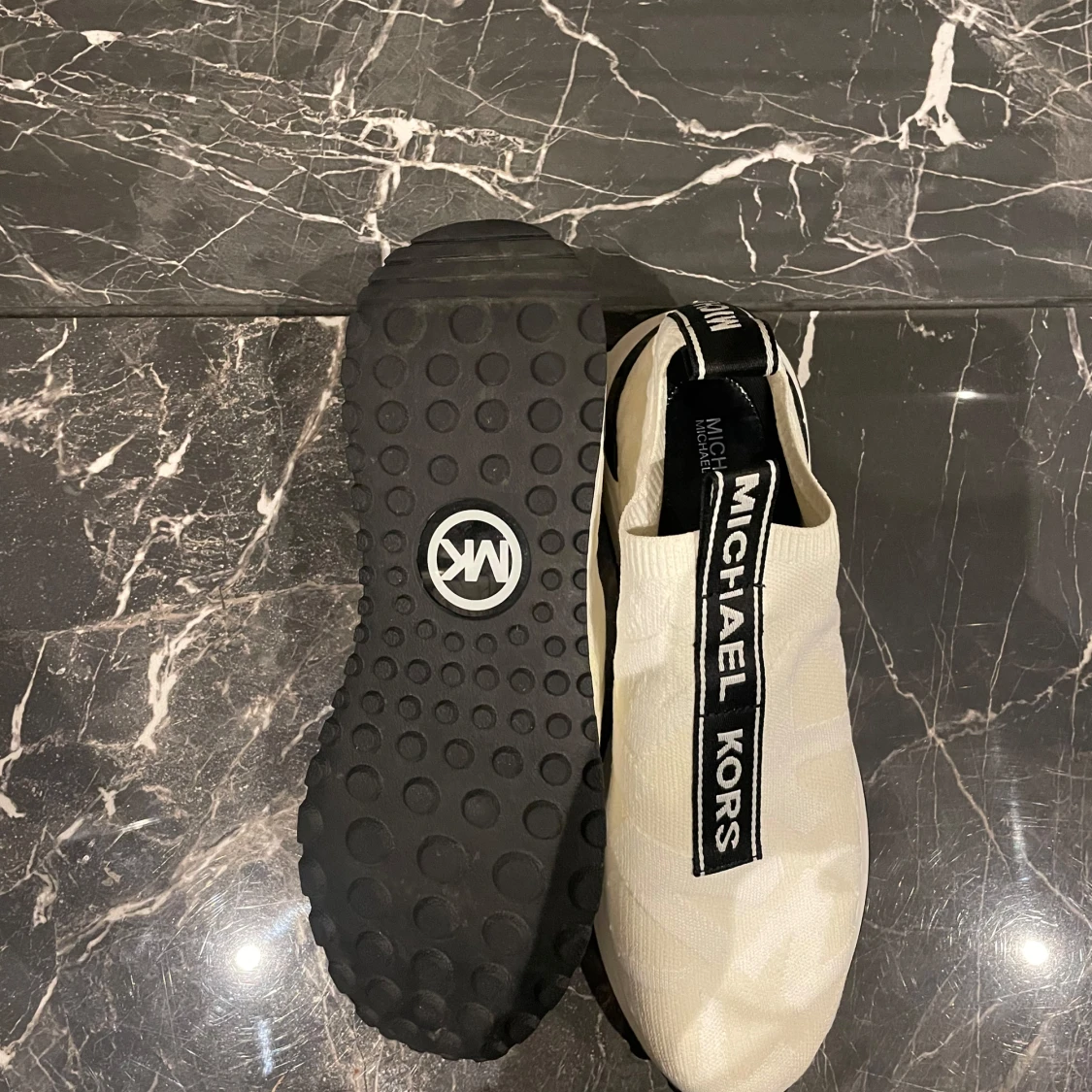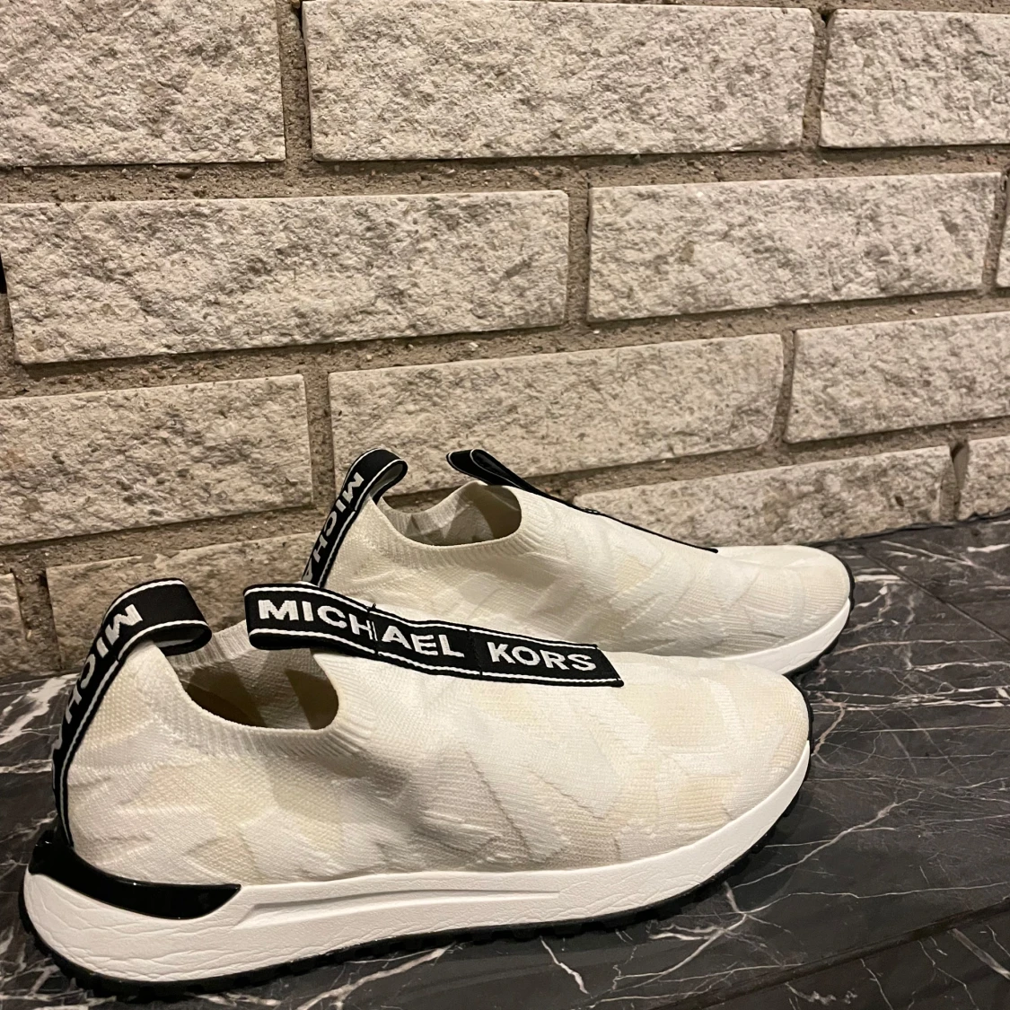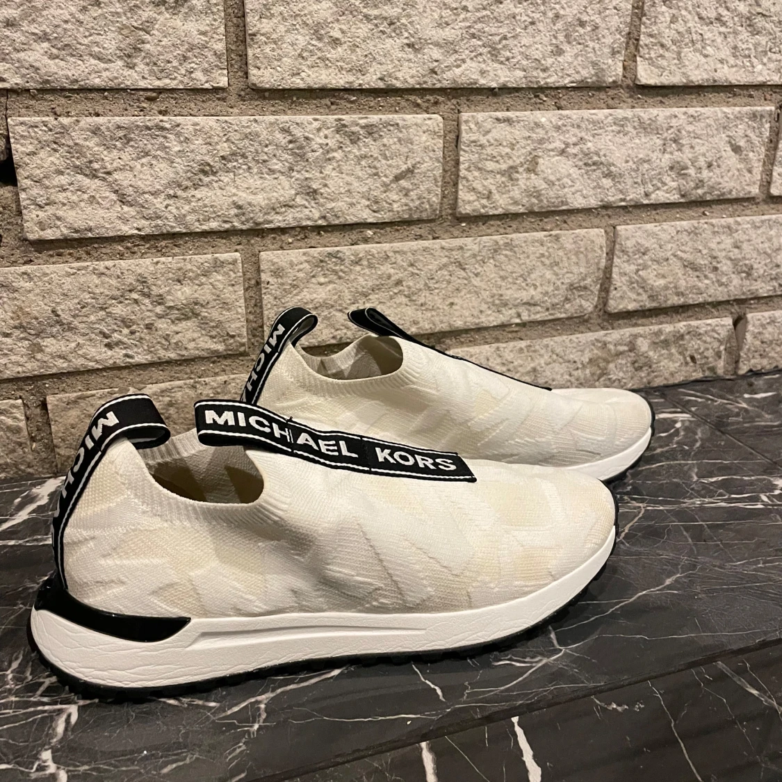 Snygga vita sneakers från Michael Kors med svart logotypband över ovansidan. Skorna har en stilren design med en bekväm sula och diskret mönster. Perfekta för en trendig look.