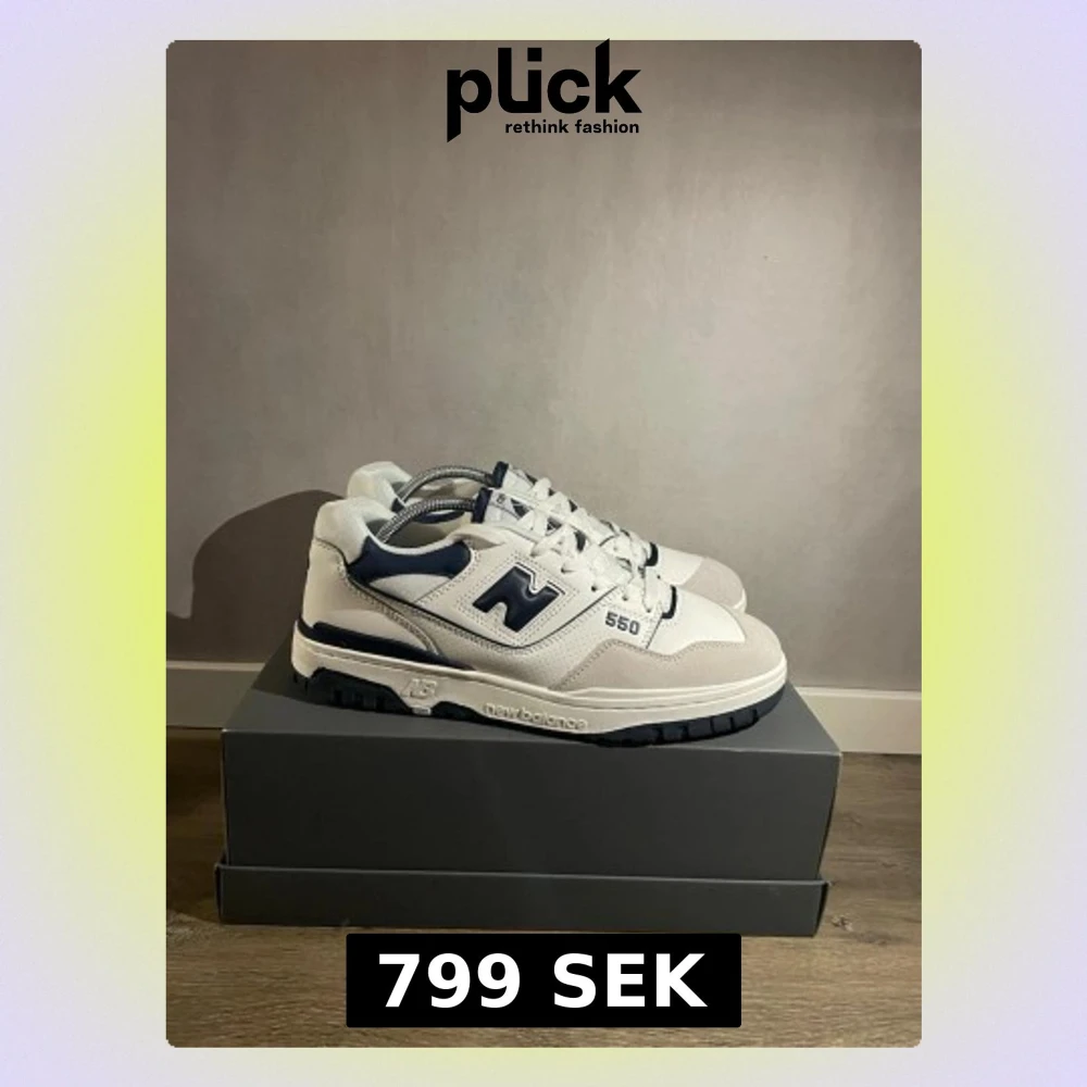 Säljer ett par New Balance 550 sneakers i vitt och marinblått. Skorna har klassisk retrodesign med läder och mockadetaljer, tydlig NB-logga på hälen och sidan samt snörning framtill. Snygg platt sula och perforerade paneler för extra stil.