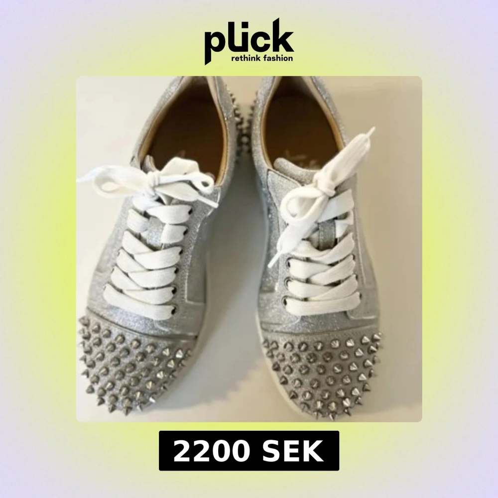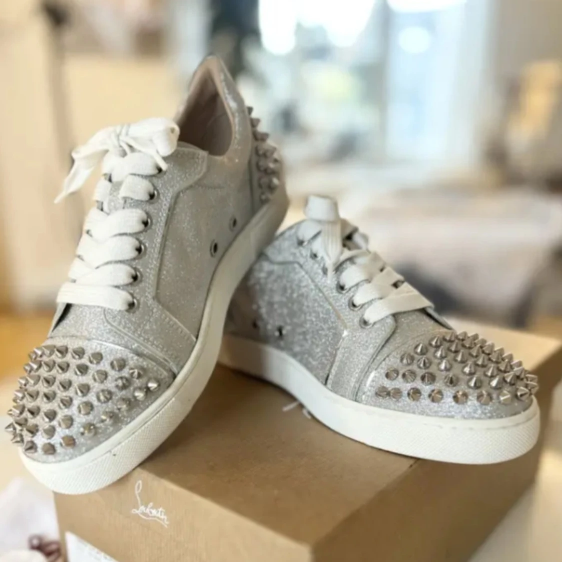 Snygga silverglittriga sneakers från Christian Louboutin med nitar på tån och hälen. Skorna har vita snören och en rund tå. Perfekta för att ge din outfit en edgy touch. De är lite slitnare än på bilden och en nit som saknas.