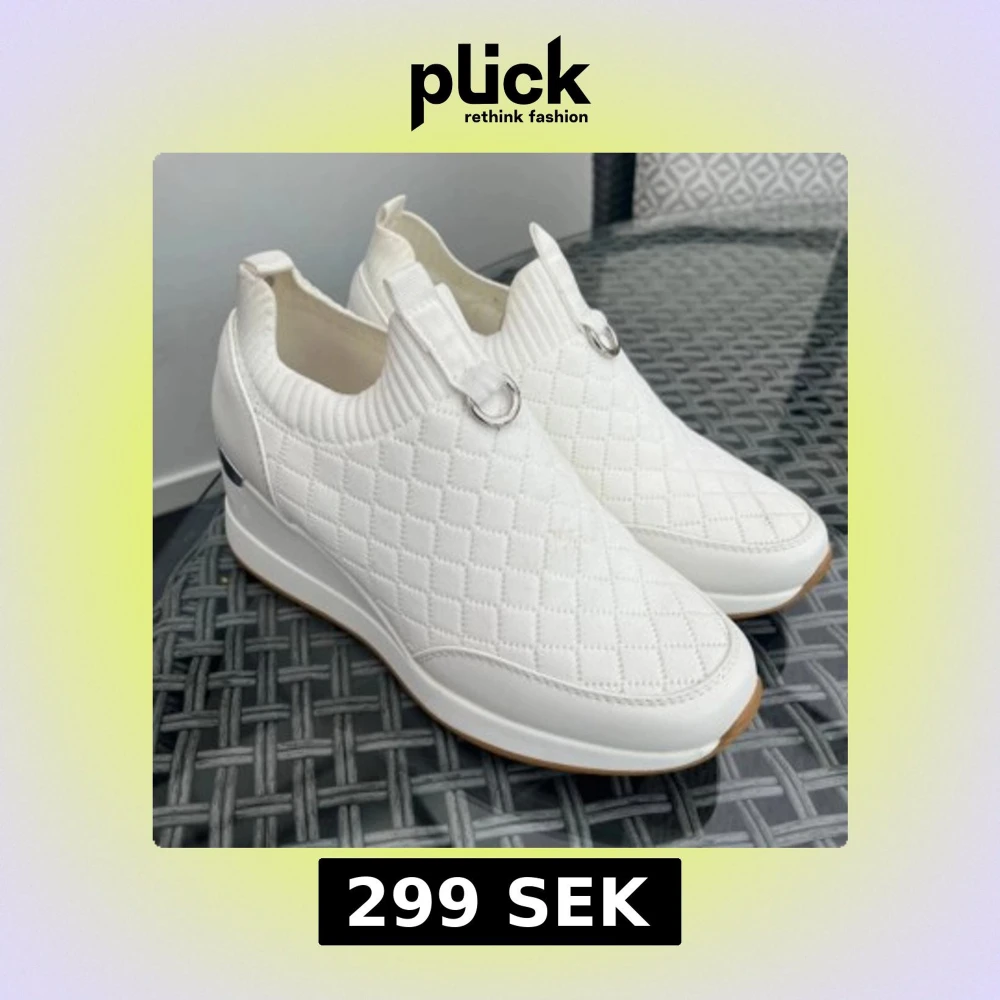 Snygga vita sneakers med quiltad design och kilklack. Skorna har en rund tå och elastisk öppning för enkel påtagning. Dekorativa metallringar framtill och en silverdetalj på hälen ger en modern touch. Endast använd en gång! Se sista bilden för liten fläck på skorna