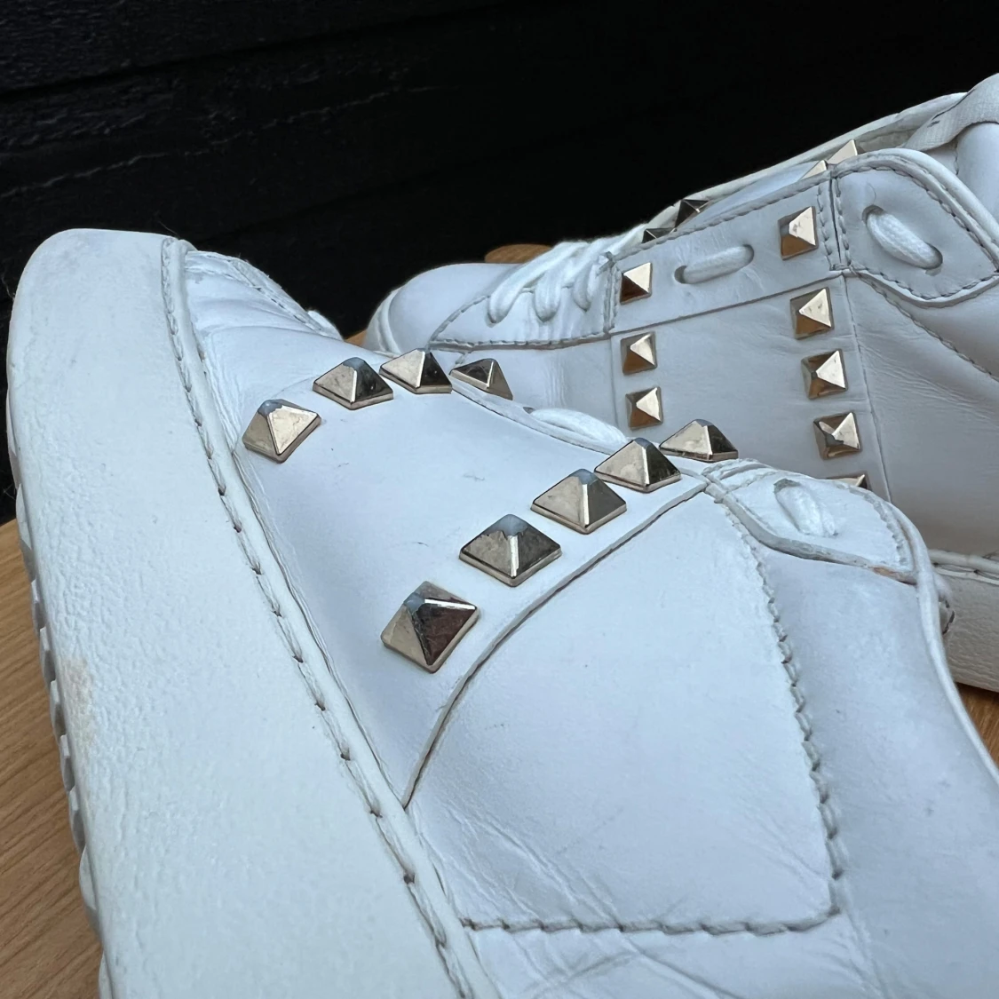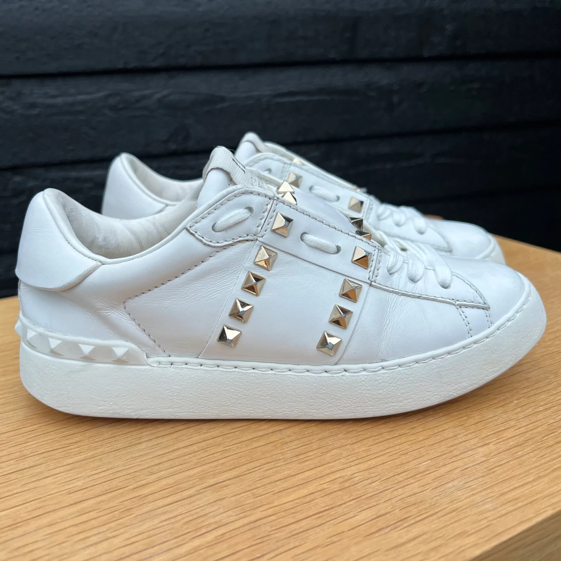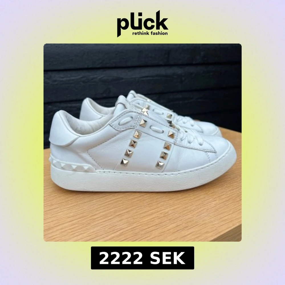 Sneakers från Valentino med guldnitar. Strl 35, innersulans mått 23.5cm. Nitarna har lite defekter se bild 5. Väl använda men ändå fräscha. Fint omhändertagna, rengjorda, putsade med skokräm, nya skosnören (ej original) - supersnygga 🤍