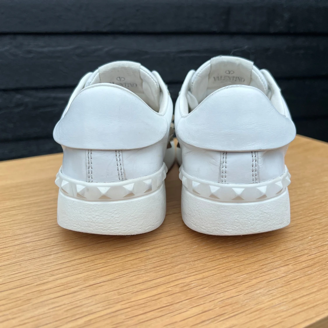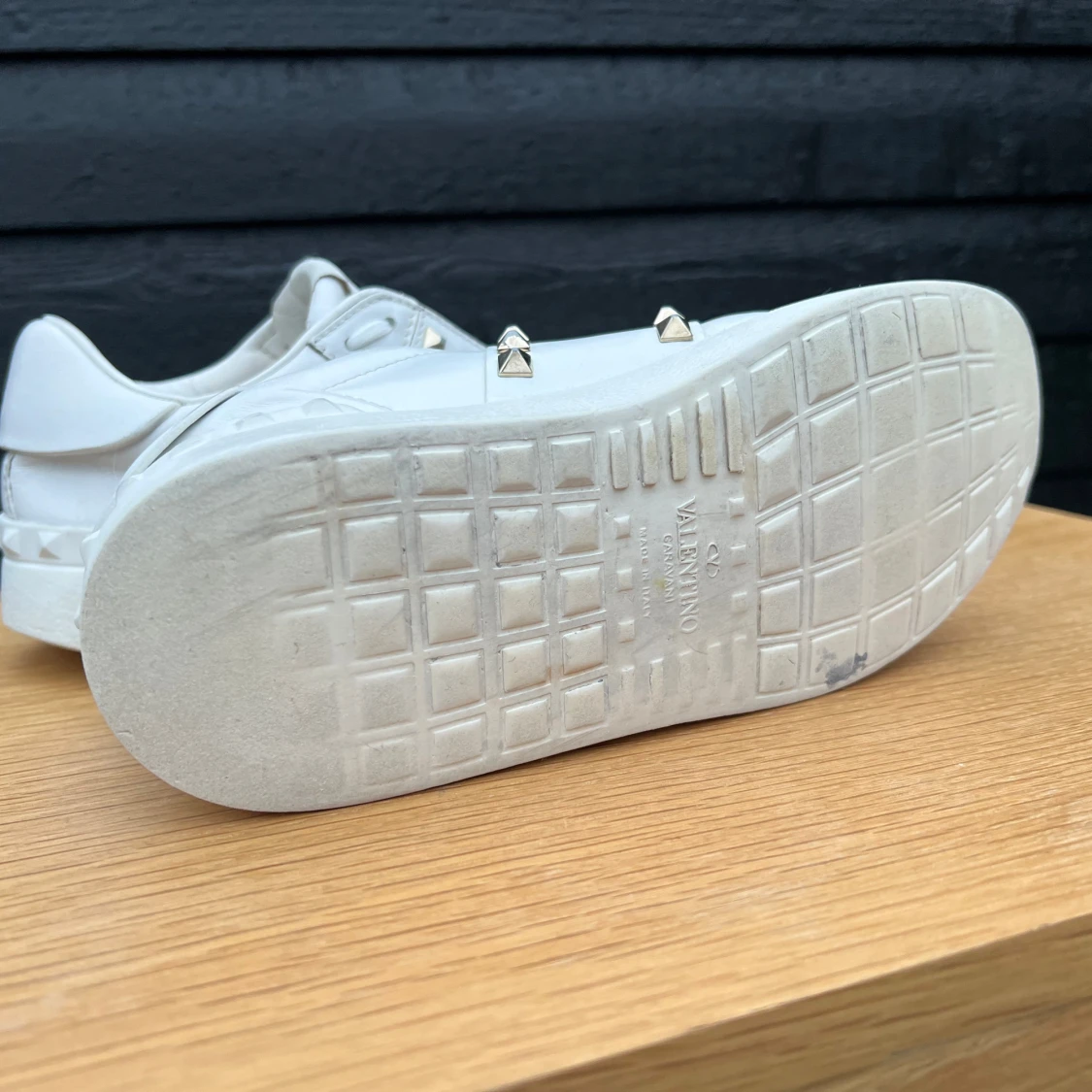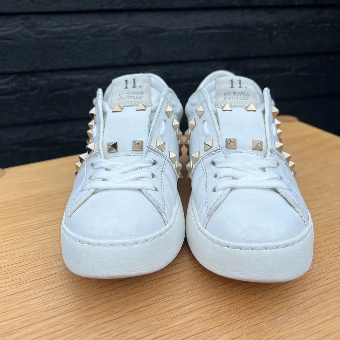 Sneakers från Valentino med guldnitar. Strl 35, innersulans mått 23.5cm. Nitarna har lite defekter se bild 5. Väl använda men ändå fräscha. Fint omhändertagna, rengjorda, putsade med skokräm, nya skosnören (ej original) - supersnygga 🤍