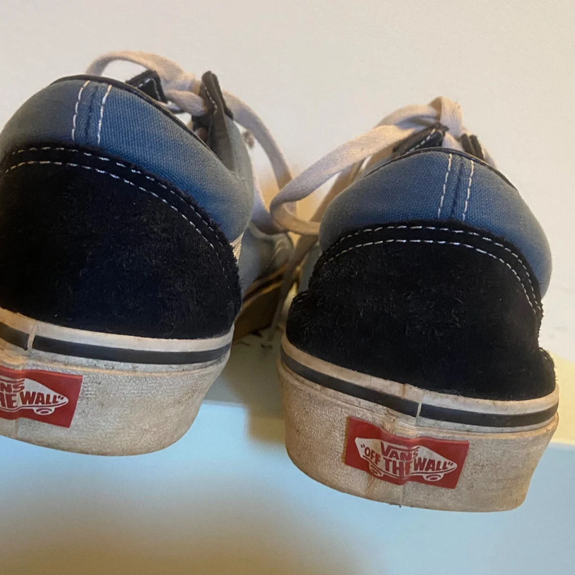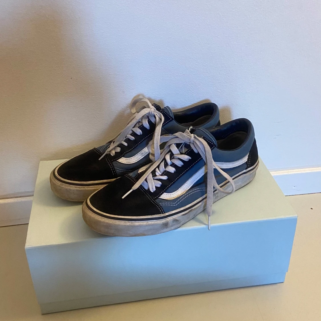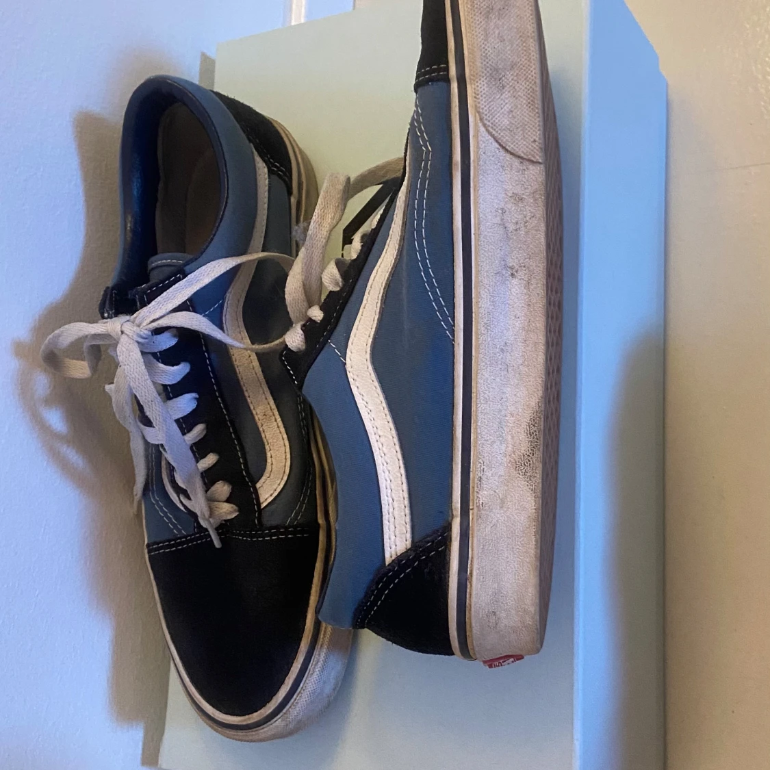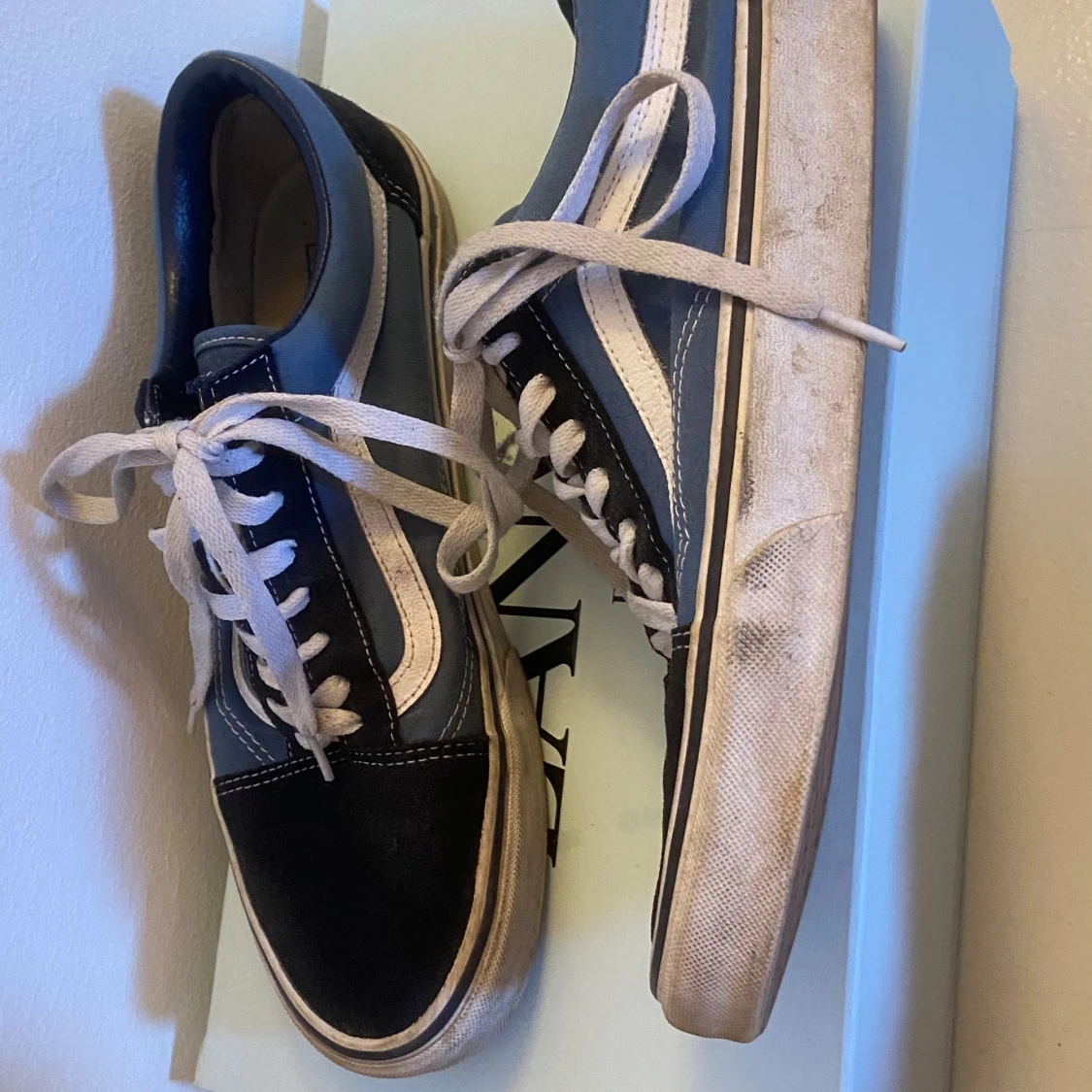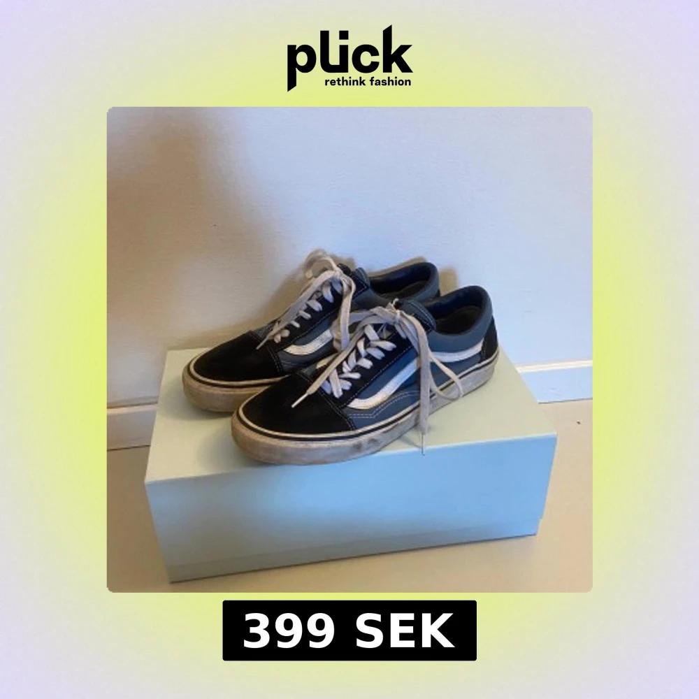 Snygga Vans sneakers i svart och blått med vita detaljer och snörning. Perfekta för en avslappnad stil. Gummisula med klassiskt mönster för bra grepp.