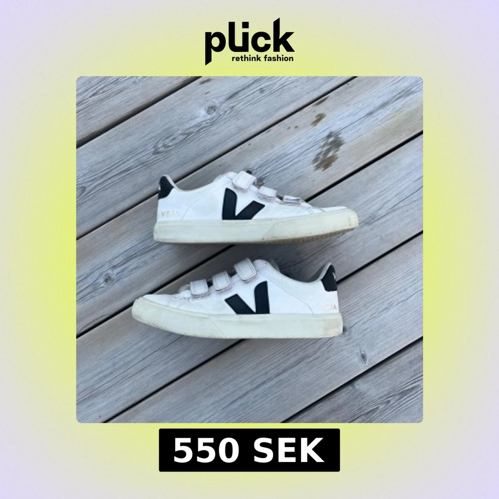Stilrena vita sneakers med kardborre från Veja. Lite slitna i hälen och en liten repa höger skons främre del.