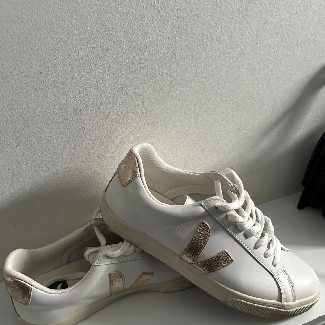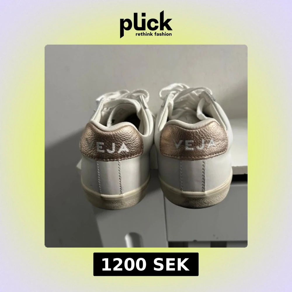 Säljer ett par snygga vita sneakers från Veja med metallicguld detaljer på häl och sidor. Skorna har klassisk låg modell, rund tå och vita skosnören. Perfekta för en stilren vardagslook.