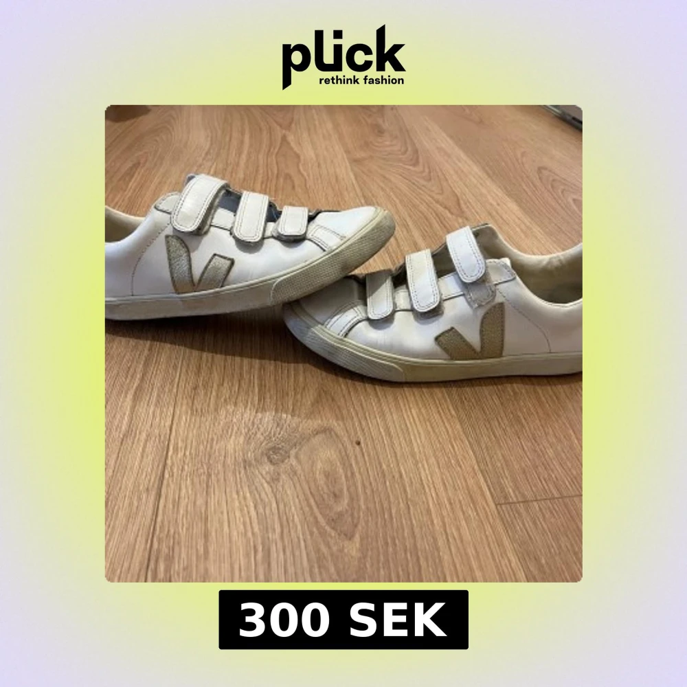 Säljer ett par skitsnygga vita sneakers från Veja med kardborreband och guldiga detaljer. Skorna har en rund tå och är tillverkade i skinn. Detaljerna är i guld. Perfekta vår och sommarskor. Har tecken på användning men fortfarande i gott skick! Fråga för fler bilder o pris kan diskuteras!!❤️