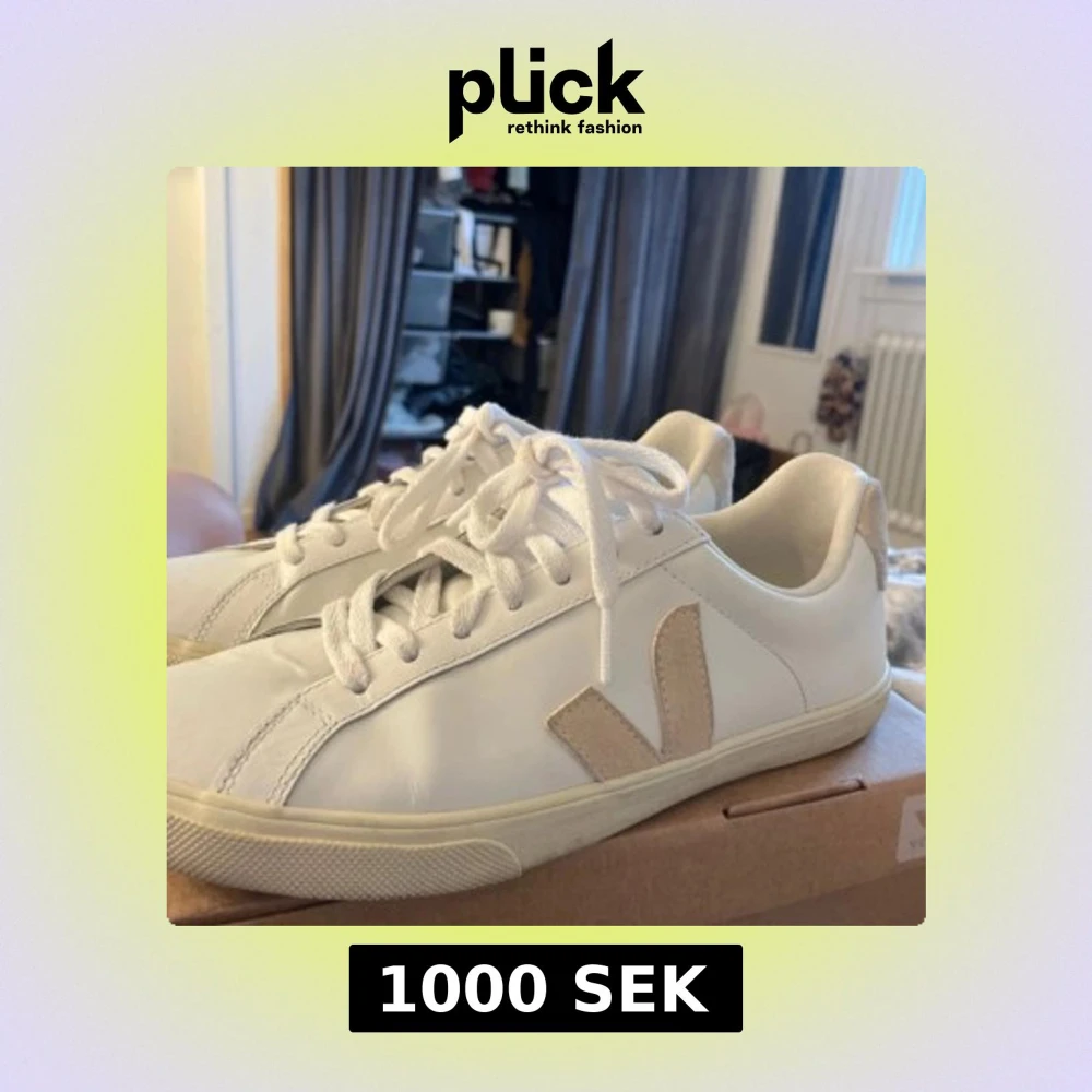Snygga vita sneakers från Veja med beige detaljer och snörning. Tillverkade i skinn med en stilren design som passar perfekt till vardags. Märket Veja syns tydligt på hälen och sidan av skorna.Pris kan diskuteras vid snabb affär!Väldigt väldigt fina, säljer då de är lite förstora för mig och har därför bara använt de ca 3 gånger! Det lite ”gråa” på märkena bak som man ser på bild 2 för att mina jeans färgade av sig. Det kan gå att fixa med rätt medel, men är inget man tänker på