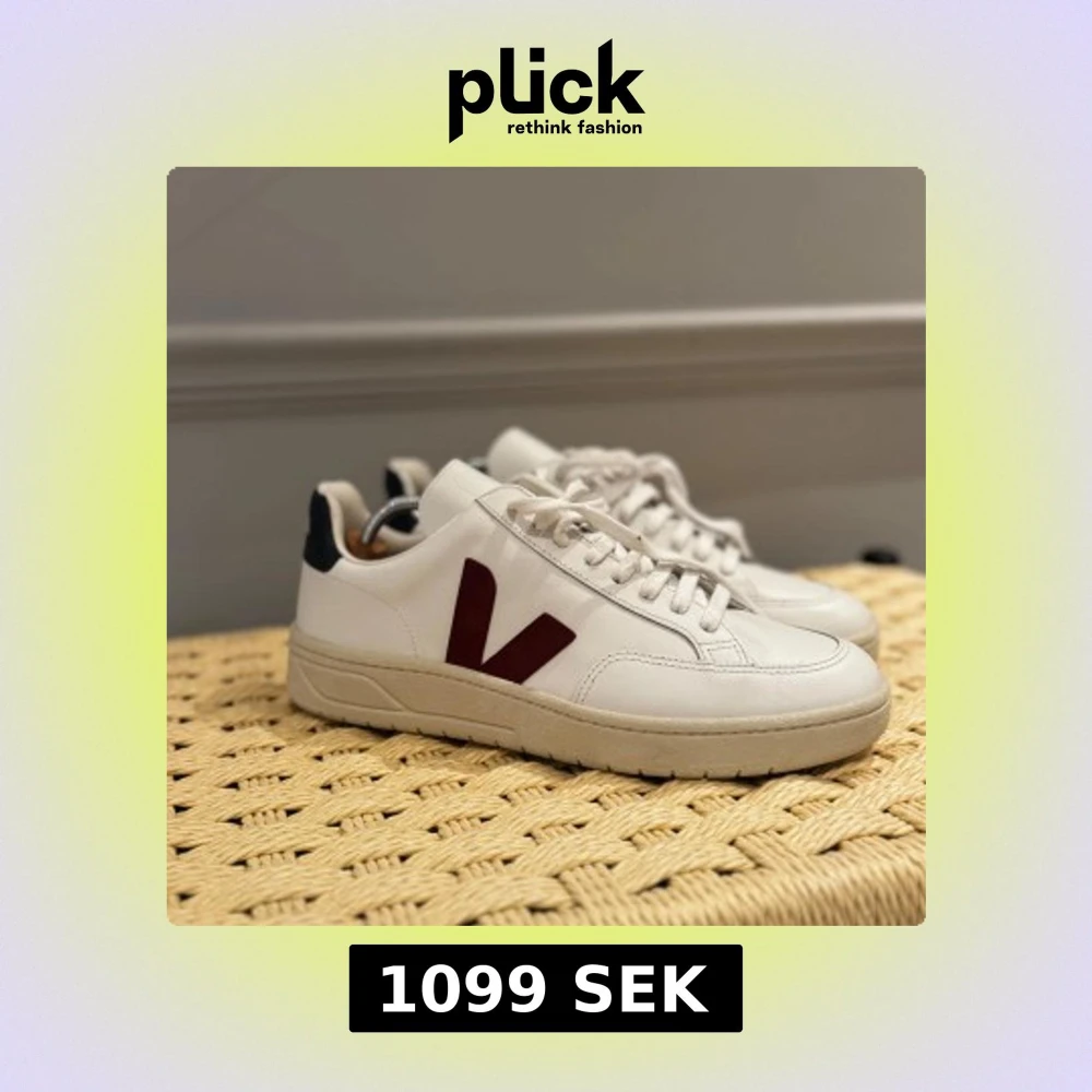 Snygga Veja V-12 med vinrött V på sidan och mörkblå hälflik. De är helt oanvända då det var ett felköp. Har dessvärre inte kvar någon låda men baserat på sulan så kan man se att de inte är använda.
