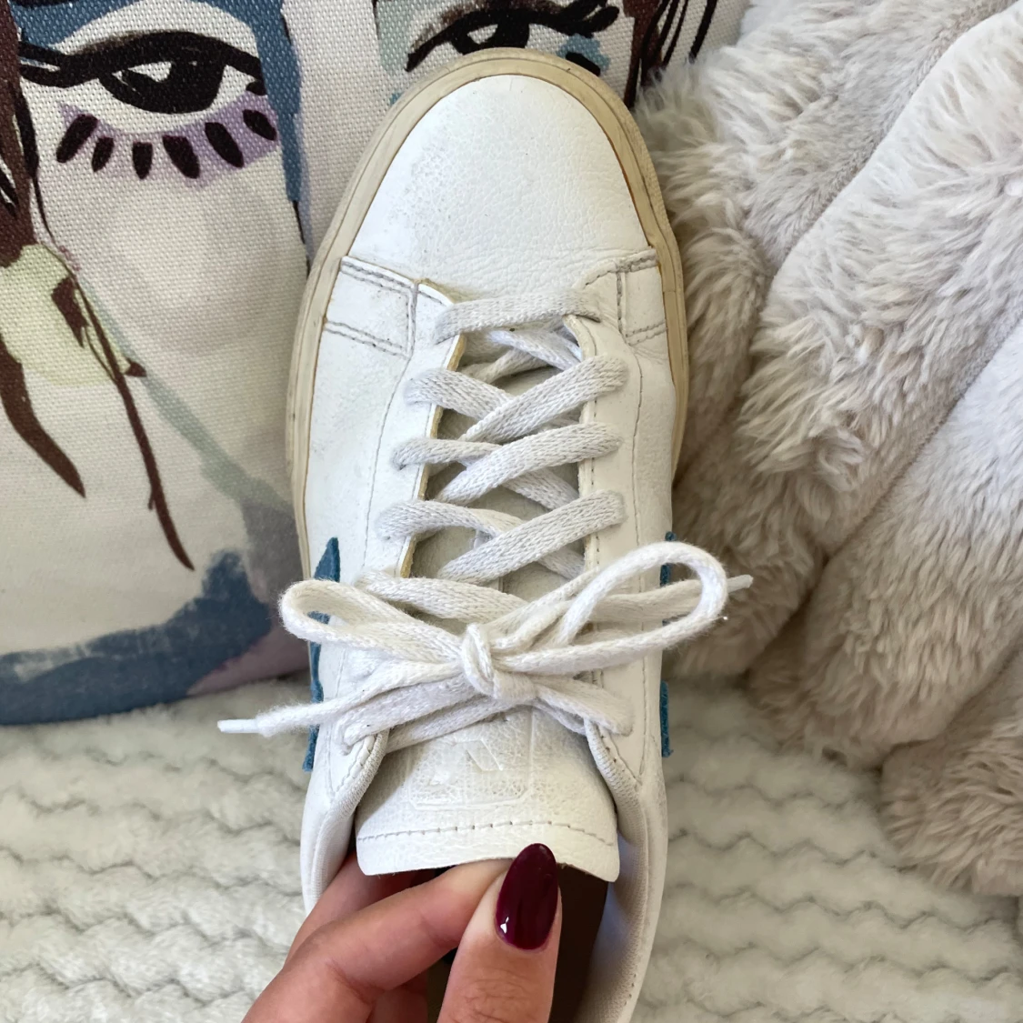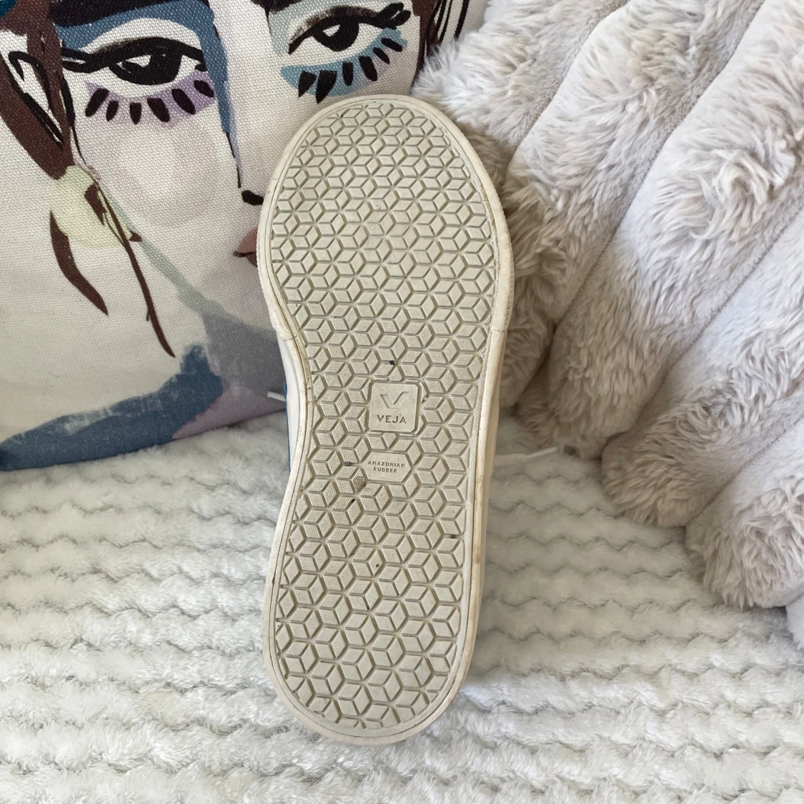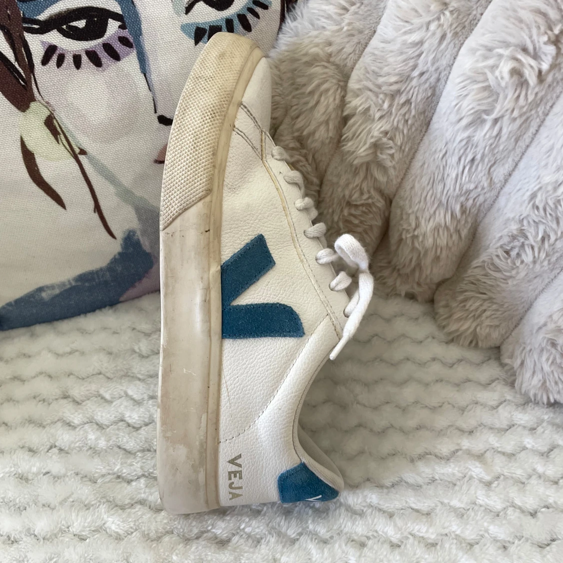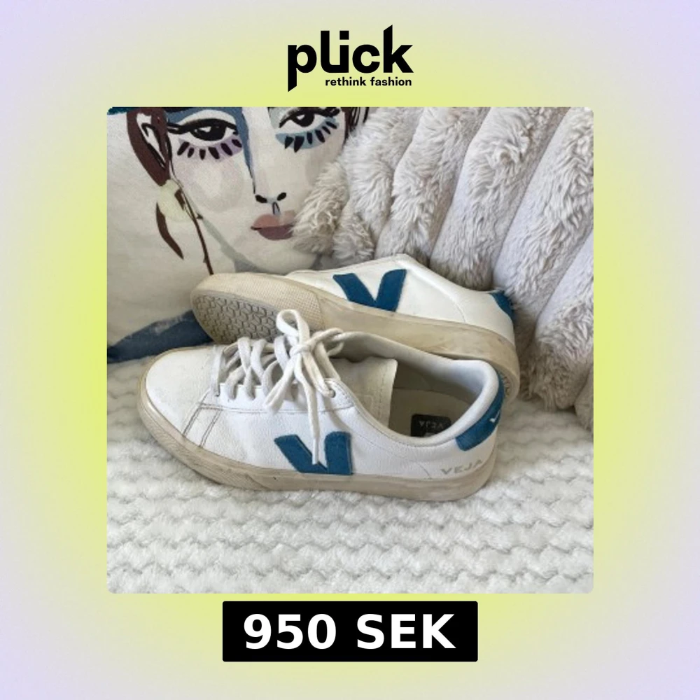 Säljer ett par klassiska Veja sneakers i vitt skinn med blått V på sidan och blå detalj vid hälen. Skorna har rund tå, platt sula och snörning framtill. Kan lätt rengöras lätt då det finns lite smuts på sulan osv.. jag använder oftast 37,5/38💗