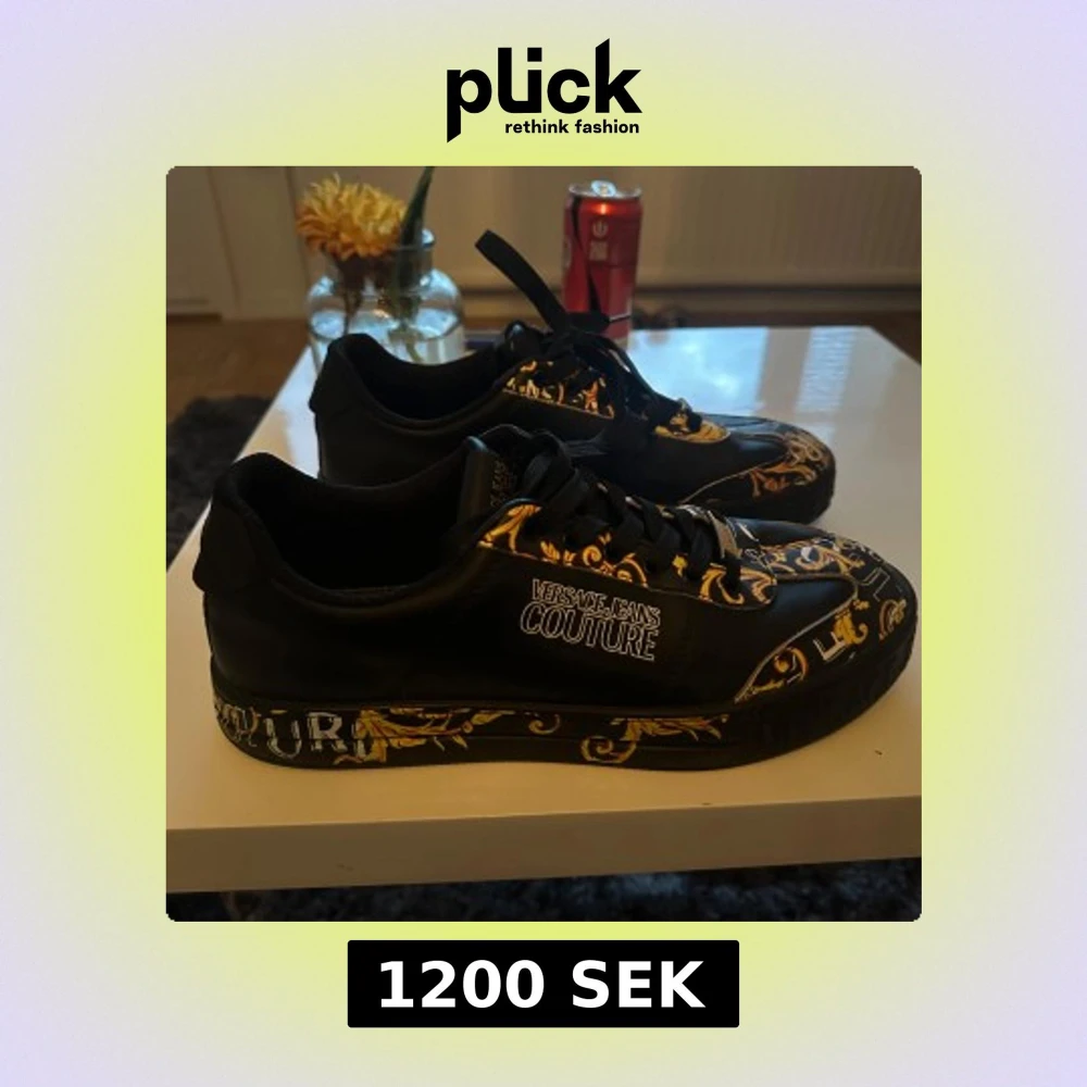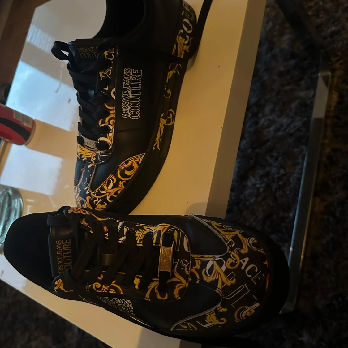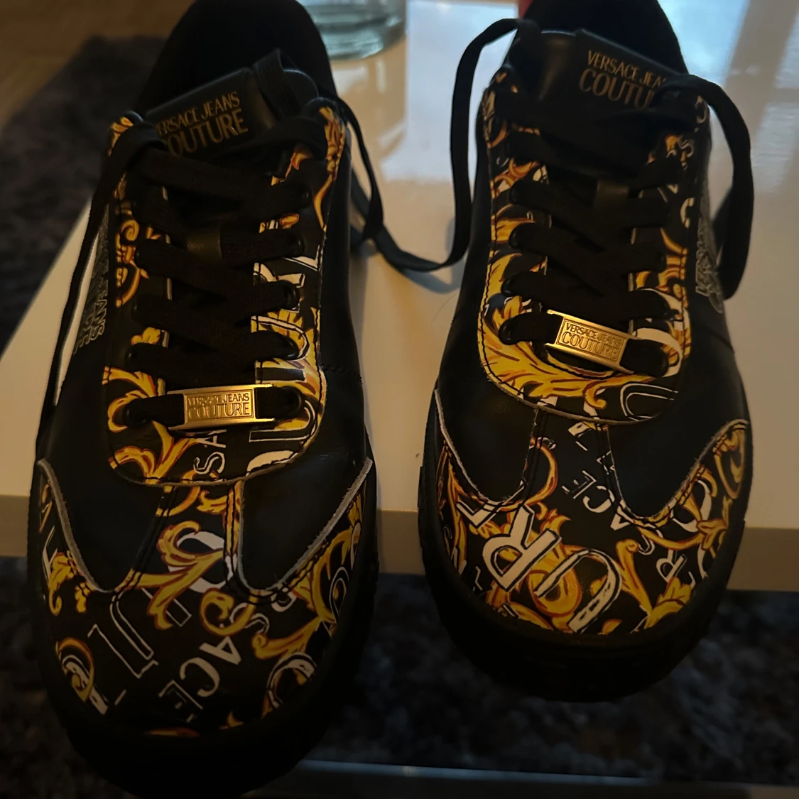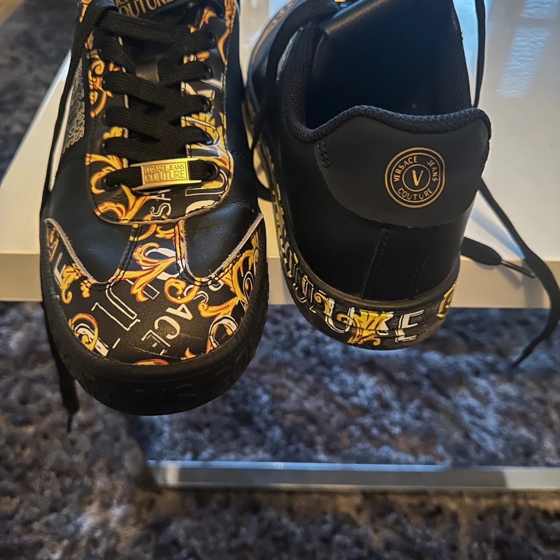 Riktig feta sneakers från Versace Jeans Couture i svart med guldiga och vita barockinspirerade detaljer och logotyptryck. Skorna har snörning, platt sula och är tillverkade i skinnliknande material. Perfekta för dig som vill sticka ut med en lyxig och trendig look använda bara några gånger