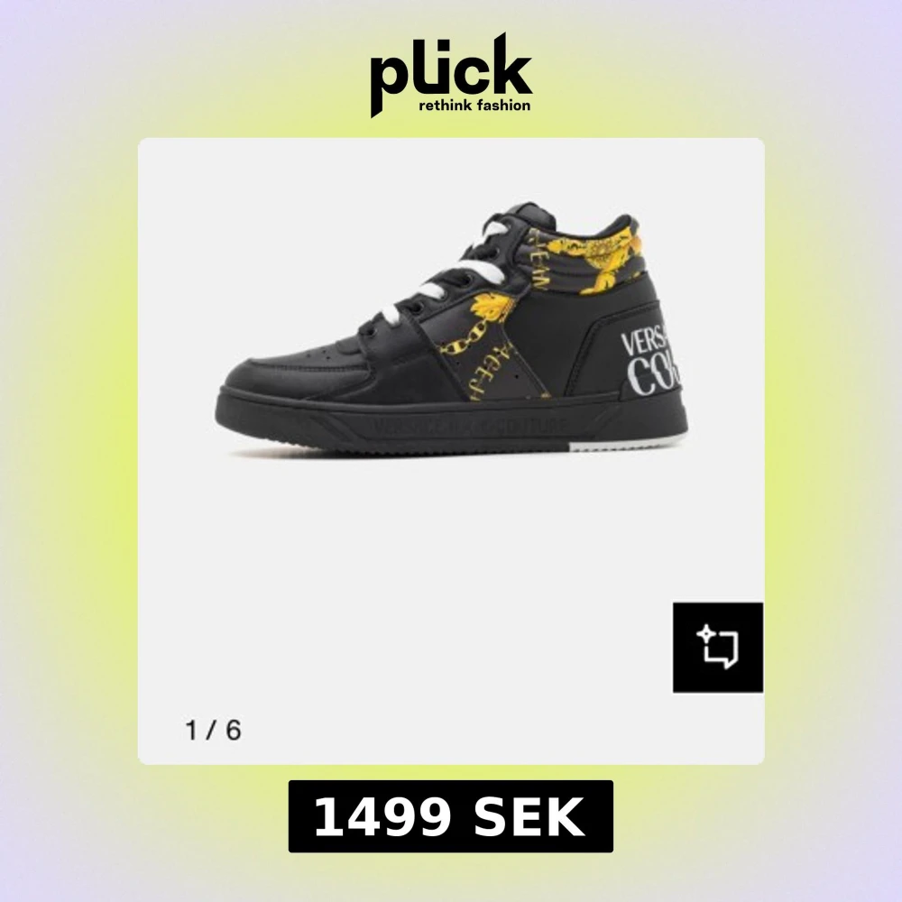 Svarta sneakers från Versace Jeans Couture med vita snören och detaljer i gult barockmönster. Skorna har en högre siluett, rund tå och platt sula. Märkeslogga syns tydligt på hälen och sidan. Tillverkade i syntetmaterial med lyxig känsla och unika detaljer.