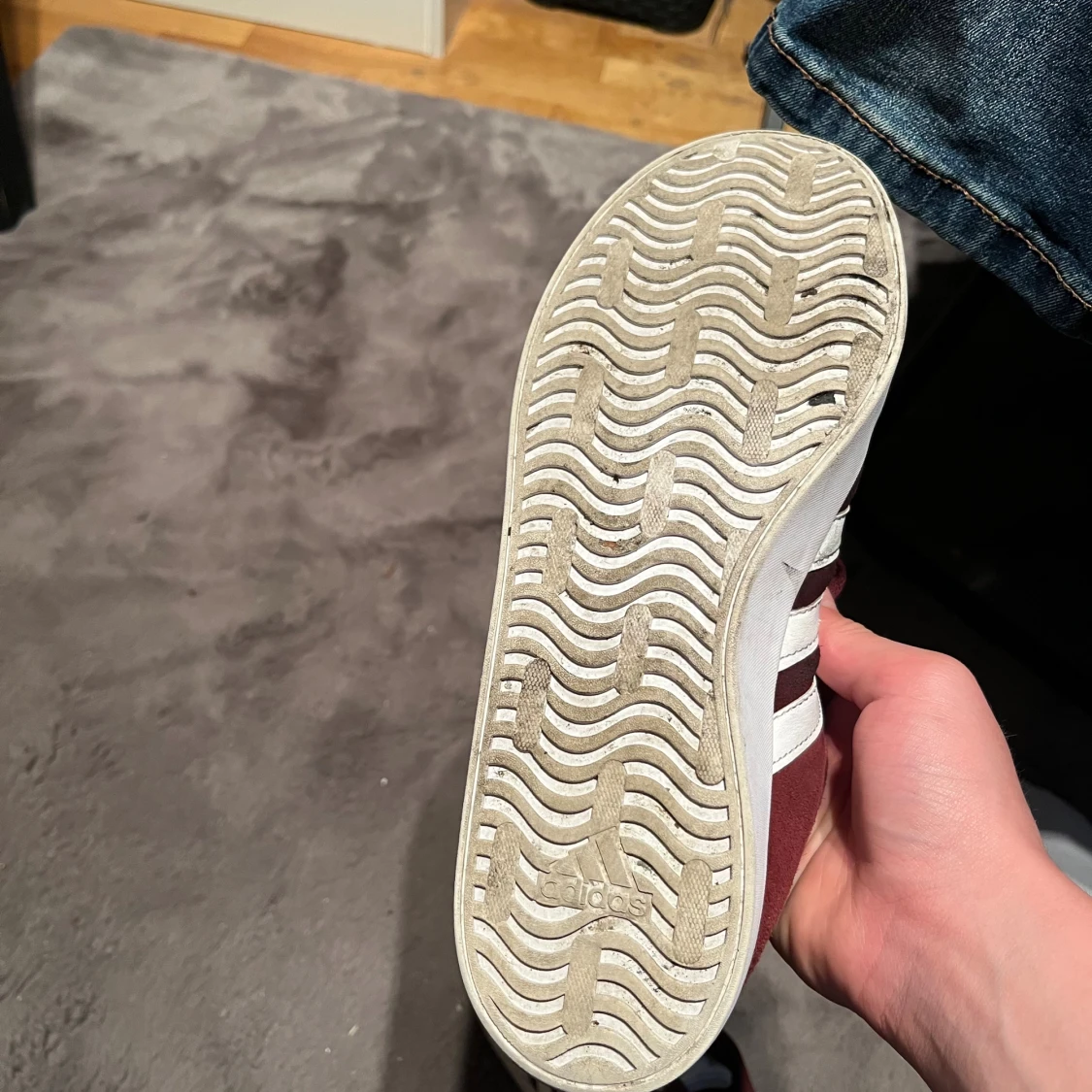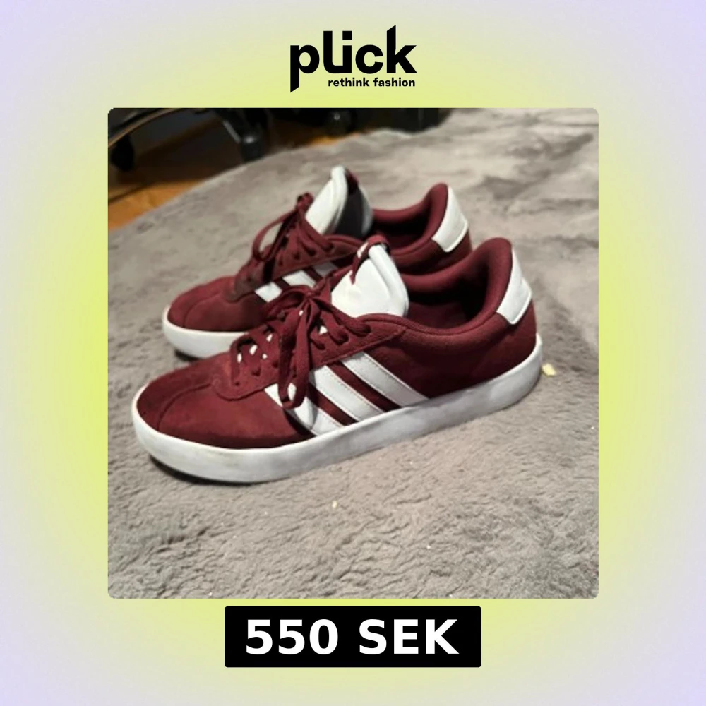 Snygga vinröda Adidas vl court 3.0 sneakers med klassiska vita ränder på sidorna och vit sula. Ovandelen är i mocka. Köptes för 3 veckor sen helt nya, säljes då dom inte passade mig