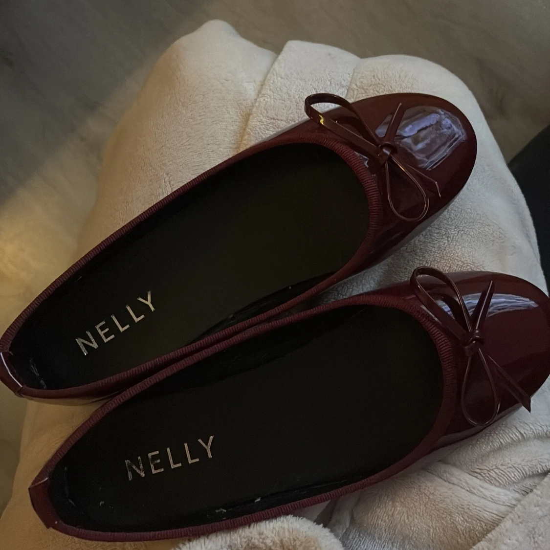Snygga vinröda ballerinaskor från Nelly med lackad finish och spetsig tå. Skorna har en söt rosettdetalj framtill och platt sula. Perfekta för dig som vill ha en stilren och trendig look.