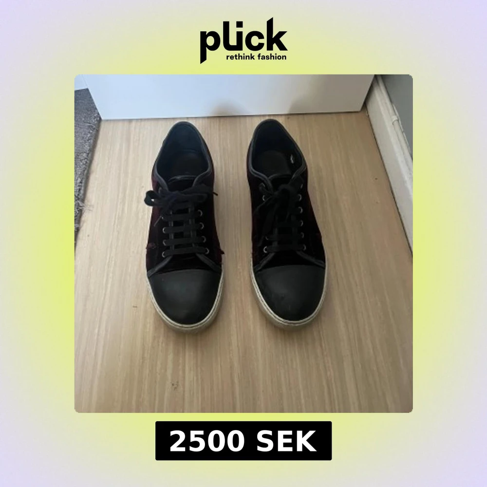 Snygga sneakers från Lanvin i svart och vinröd sammet. Skorna har en klassisk snörning och en robust gummisula. Perfekta för en stilren look med en touch av lyx. Lite crease skador och lite skada där bak annars lugnt. Storlek 43-44
